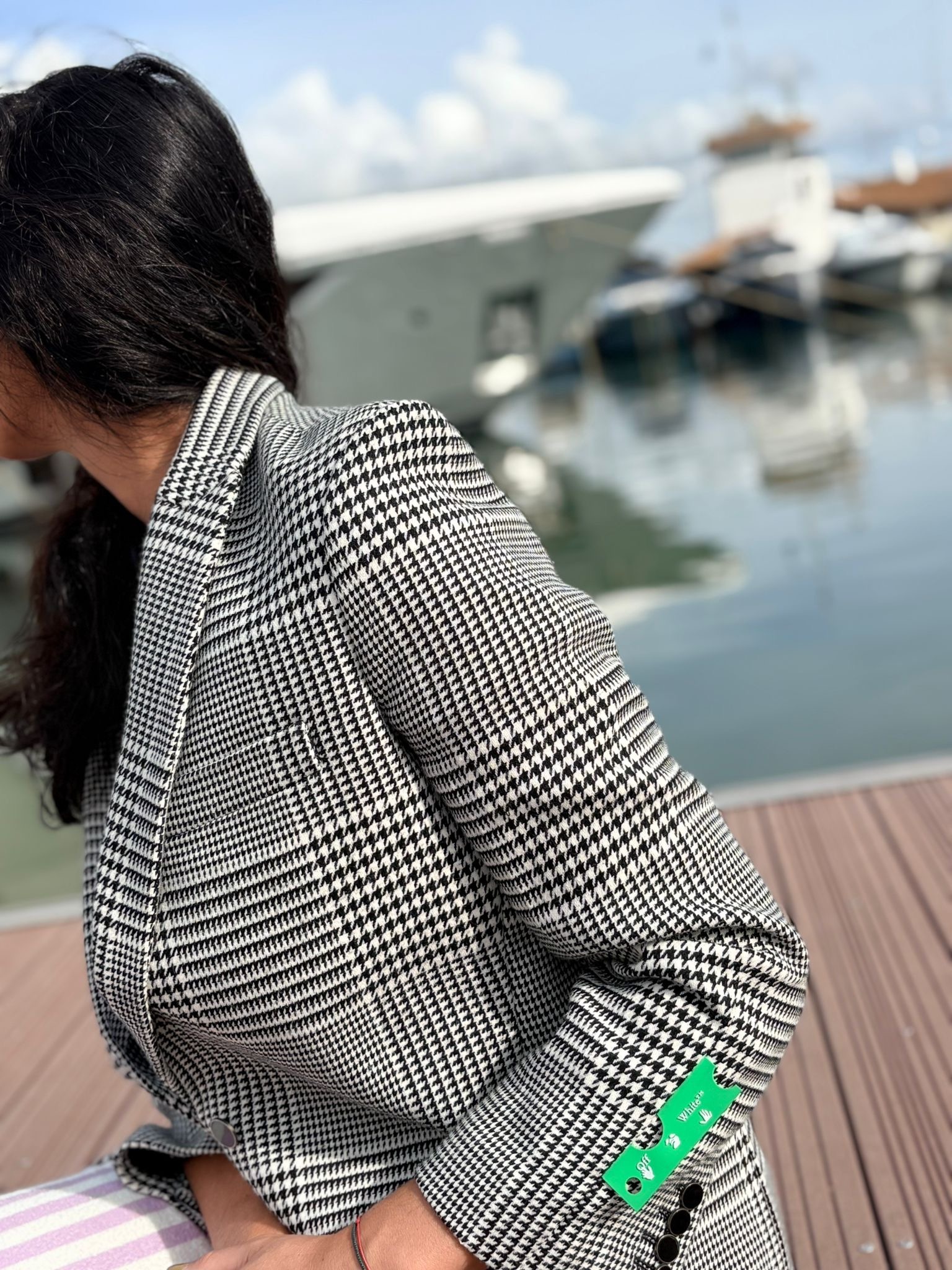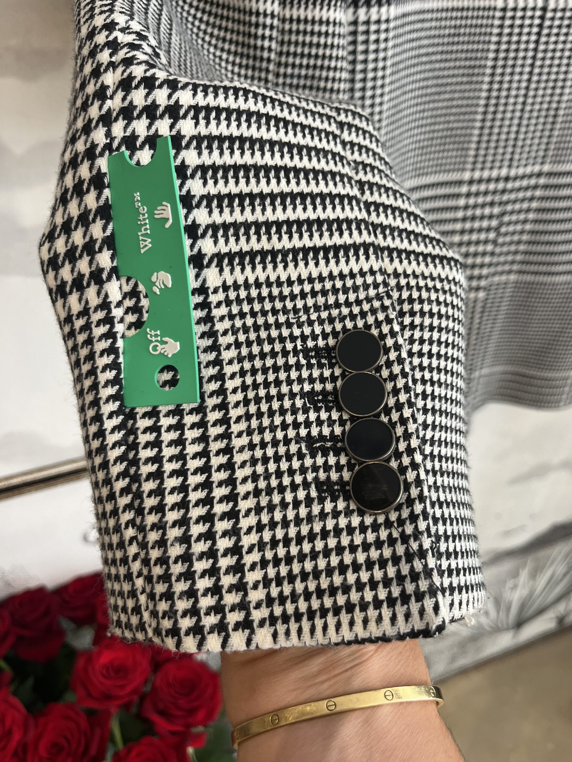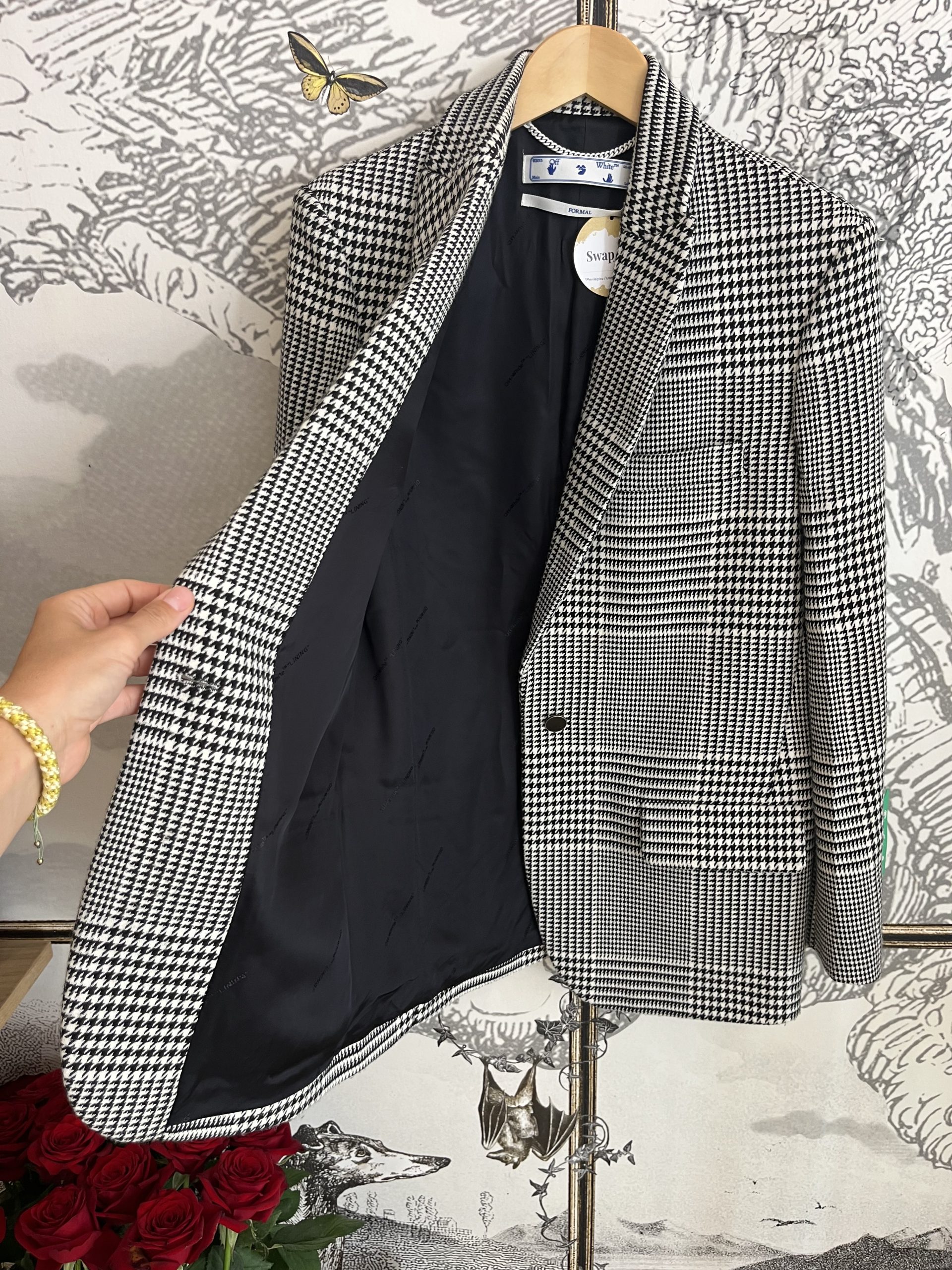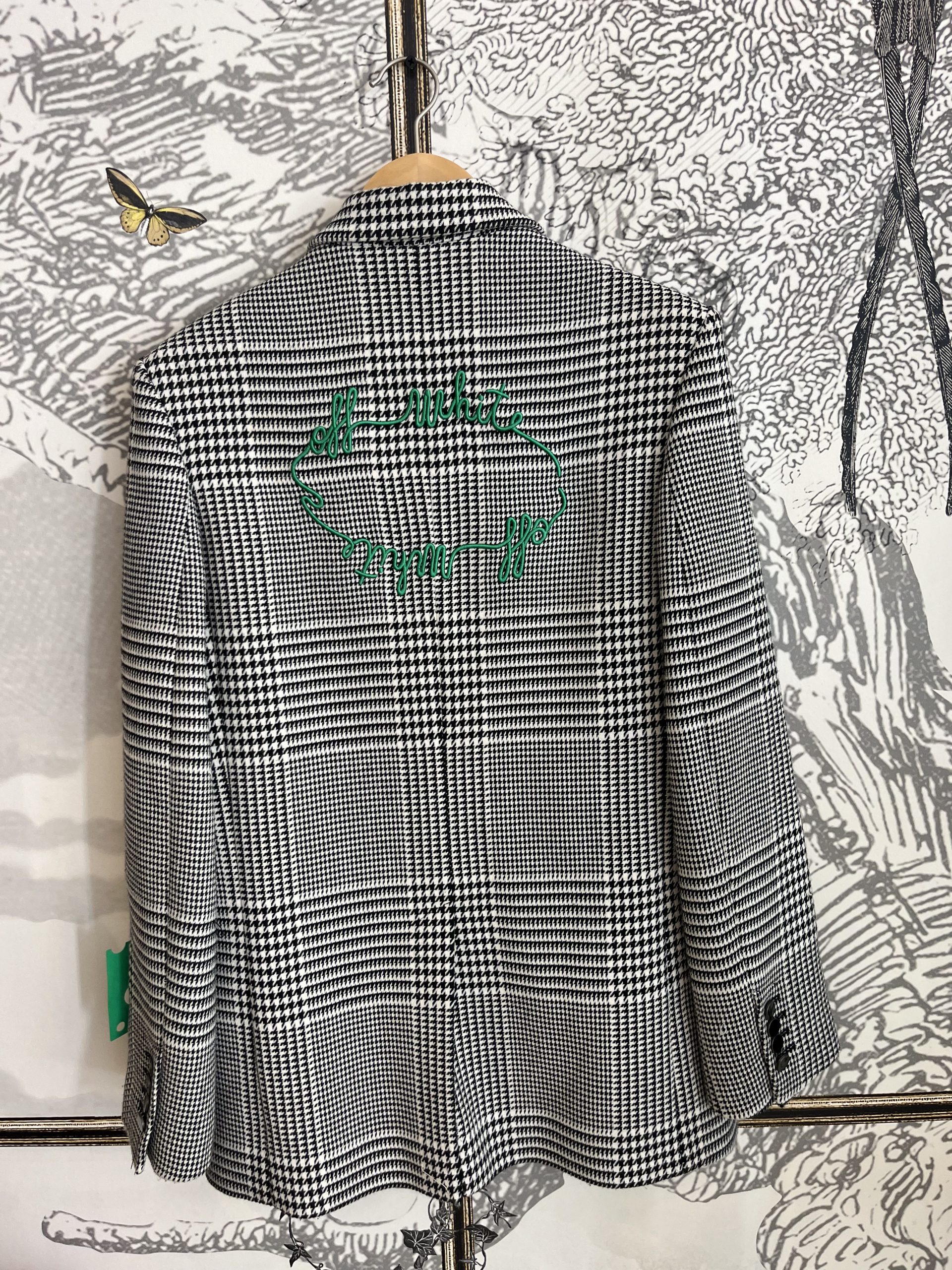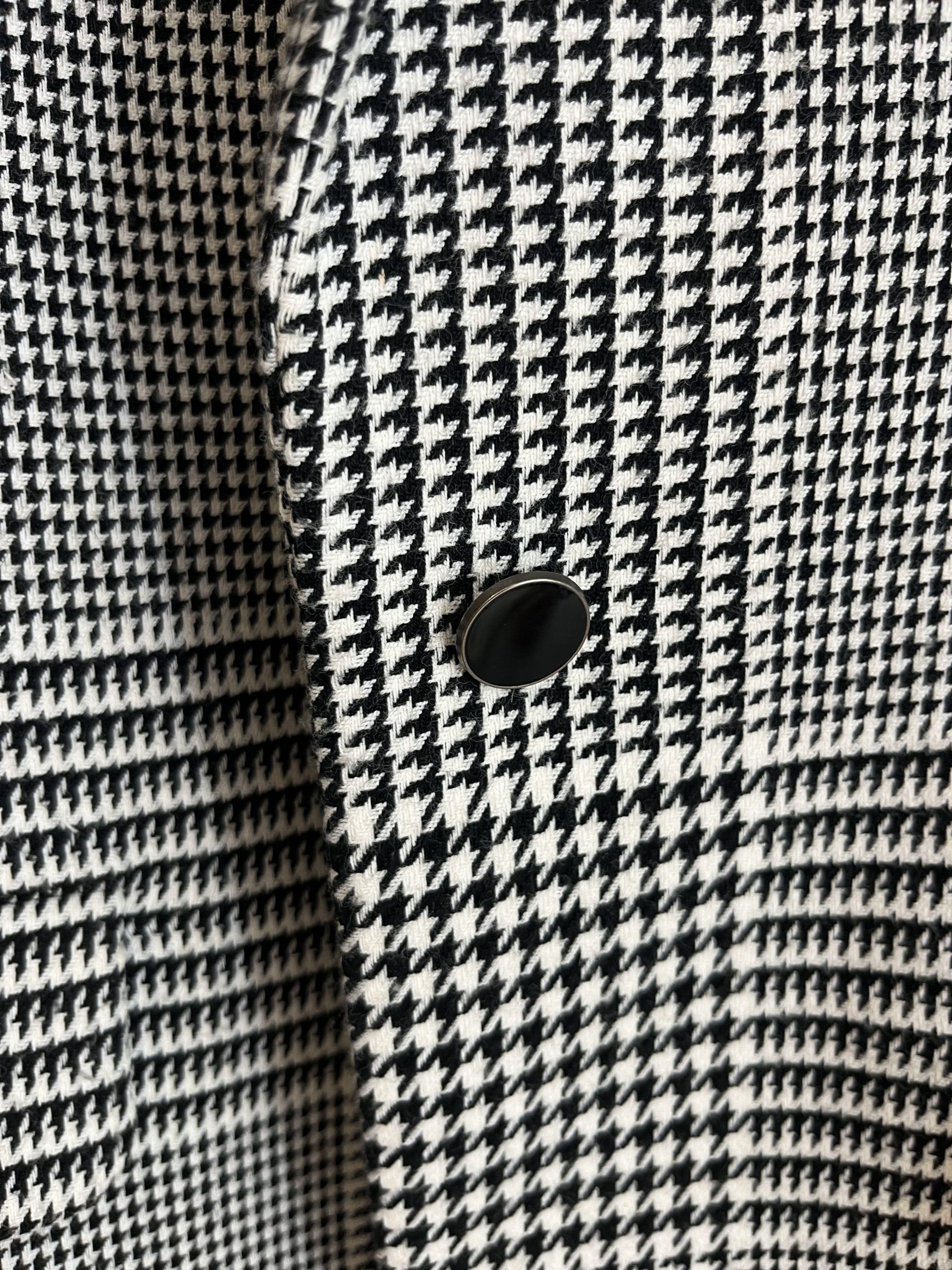 Blazer off-white, orné de de motifs noirs et de détails subtils. Un must-have.