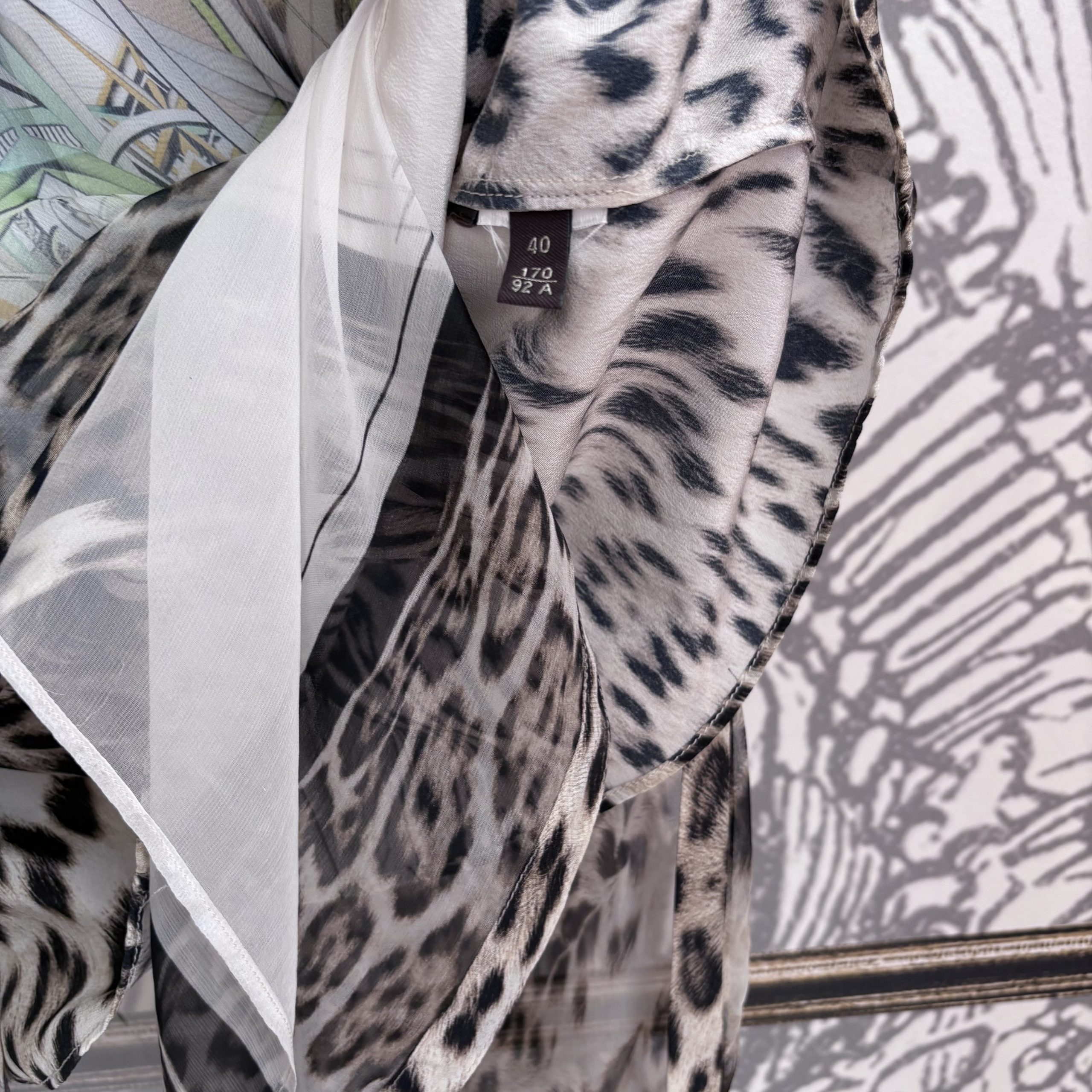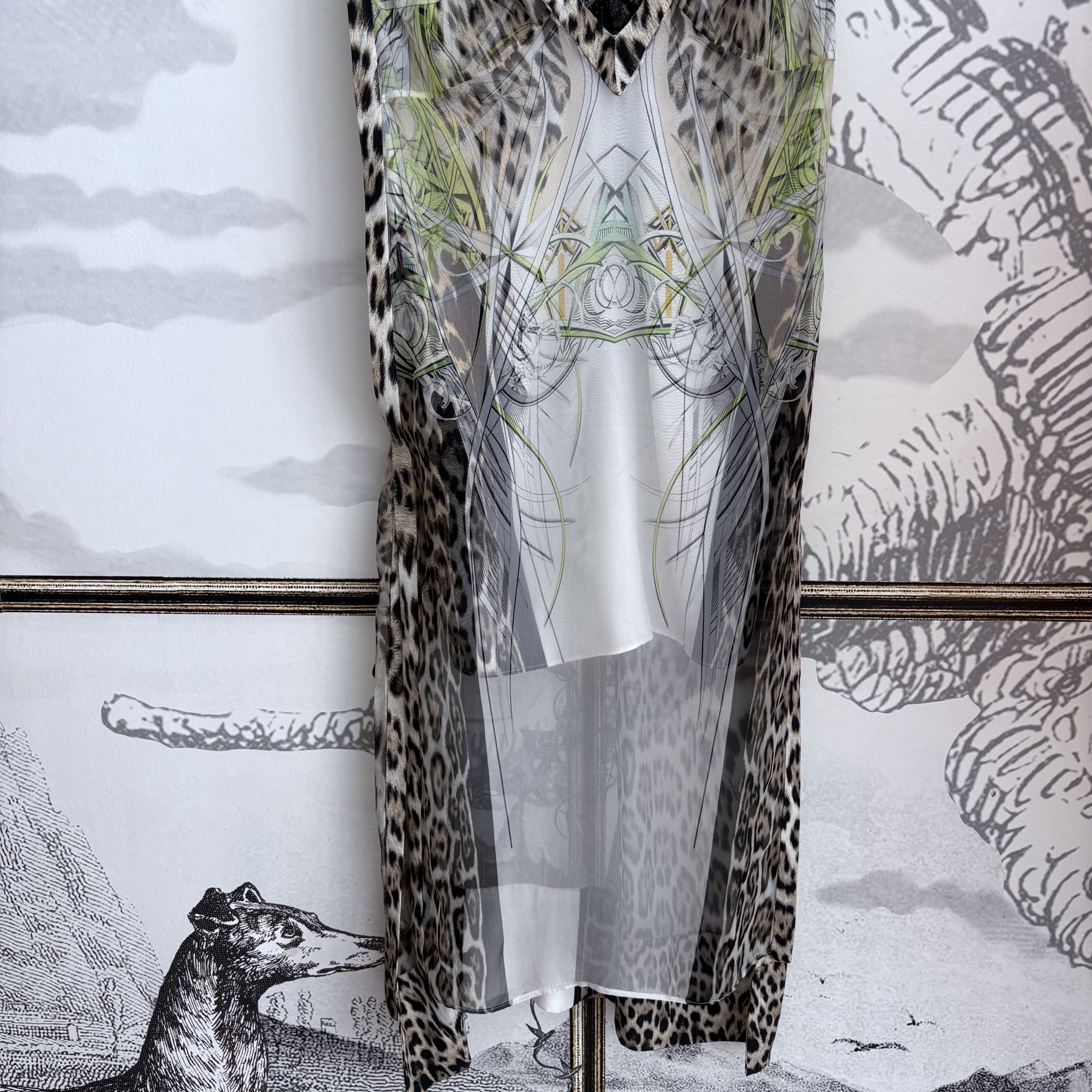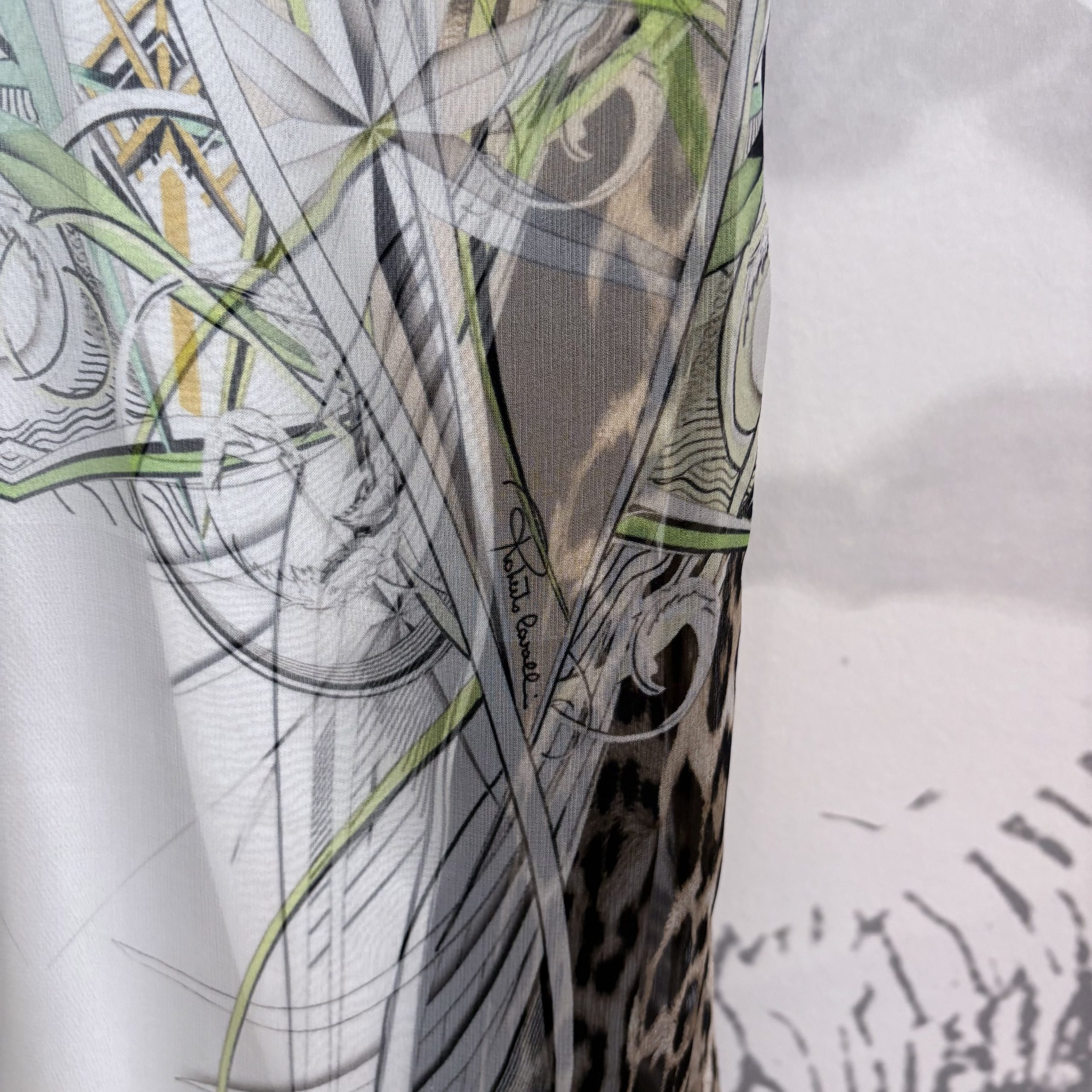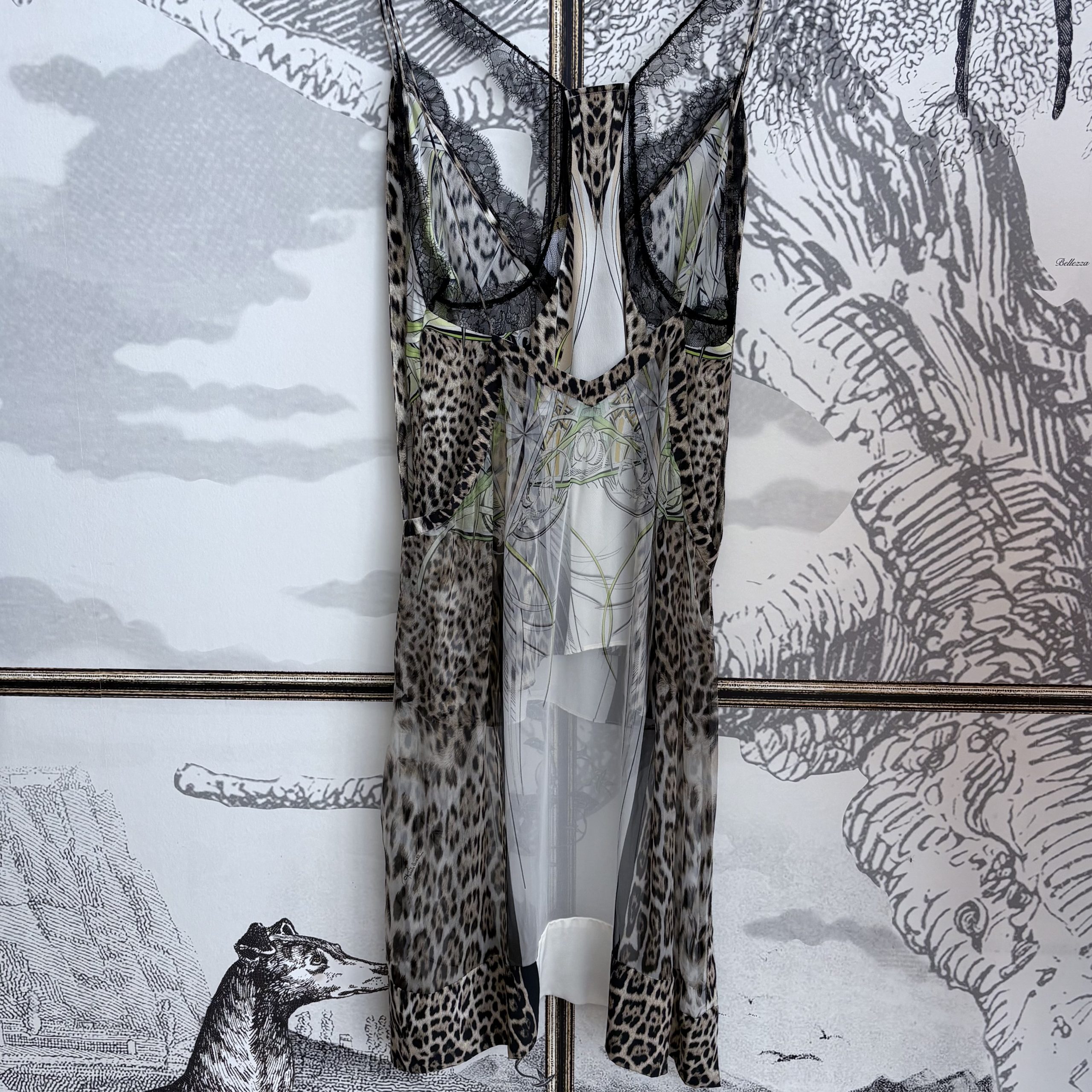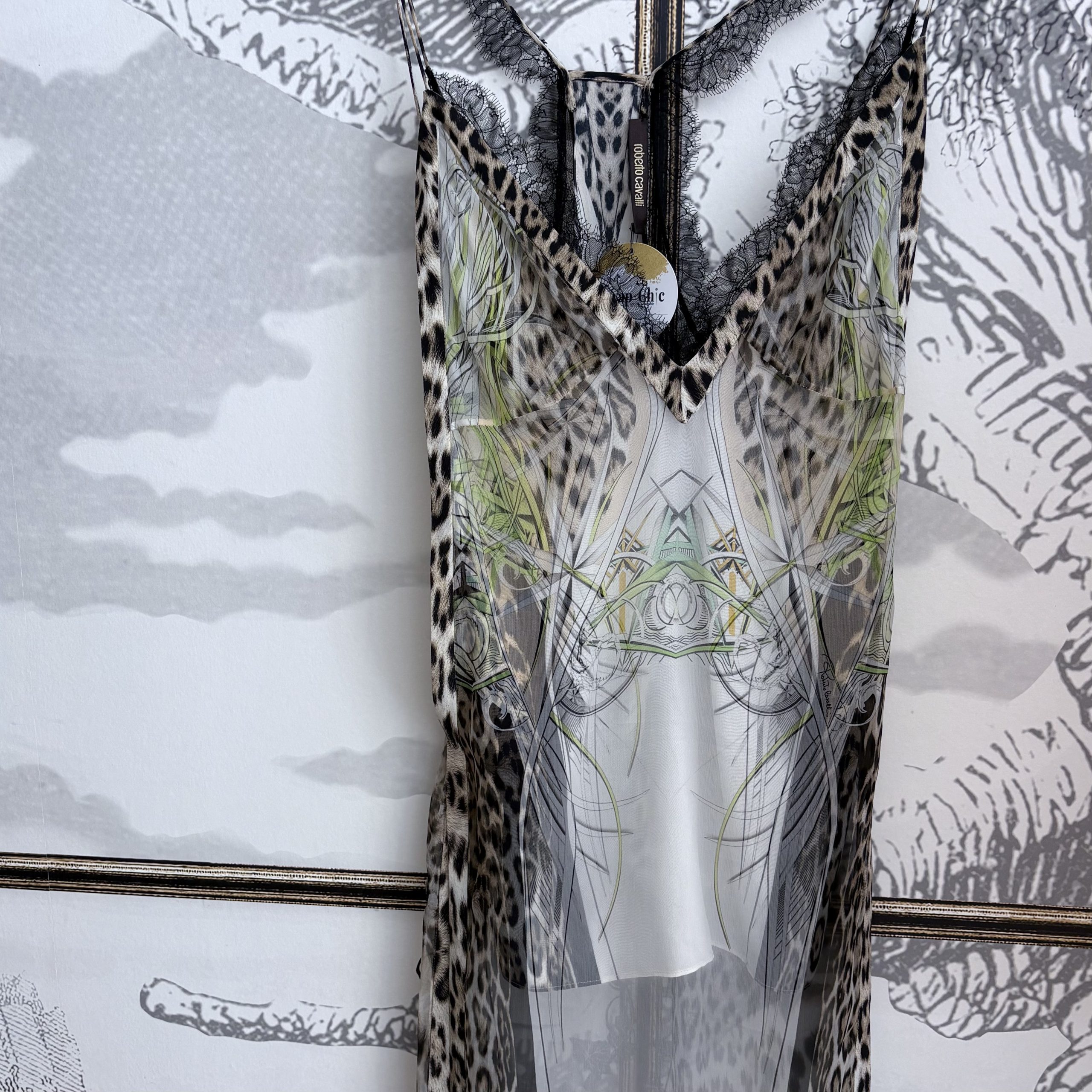 En soie raffinée, composé de deux parties superposées : une doublure plus courte et un voile long en transparence. Détails délicats en dentelle, signature de l’élégance Cavalli