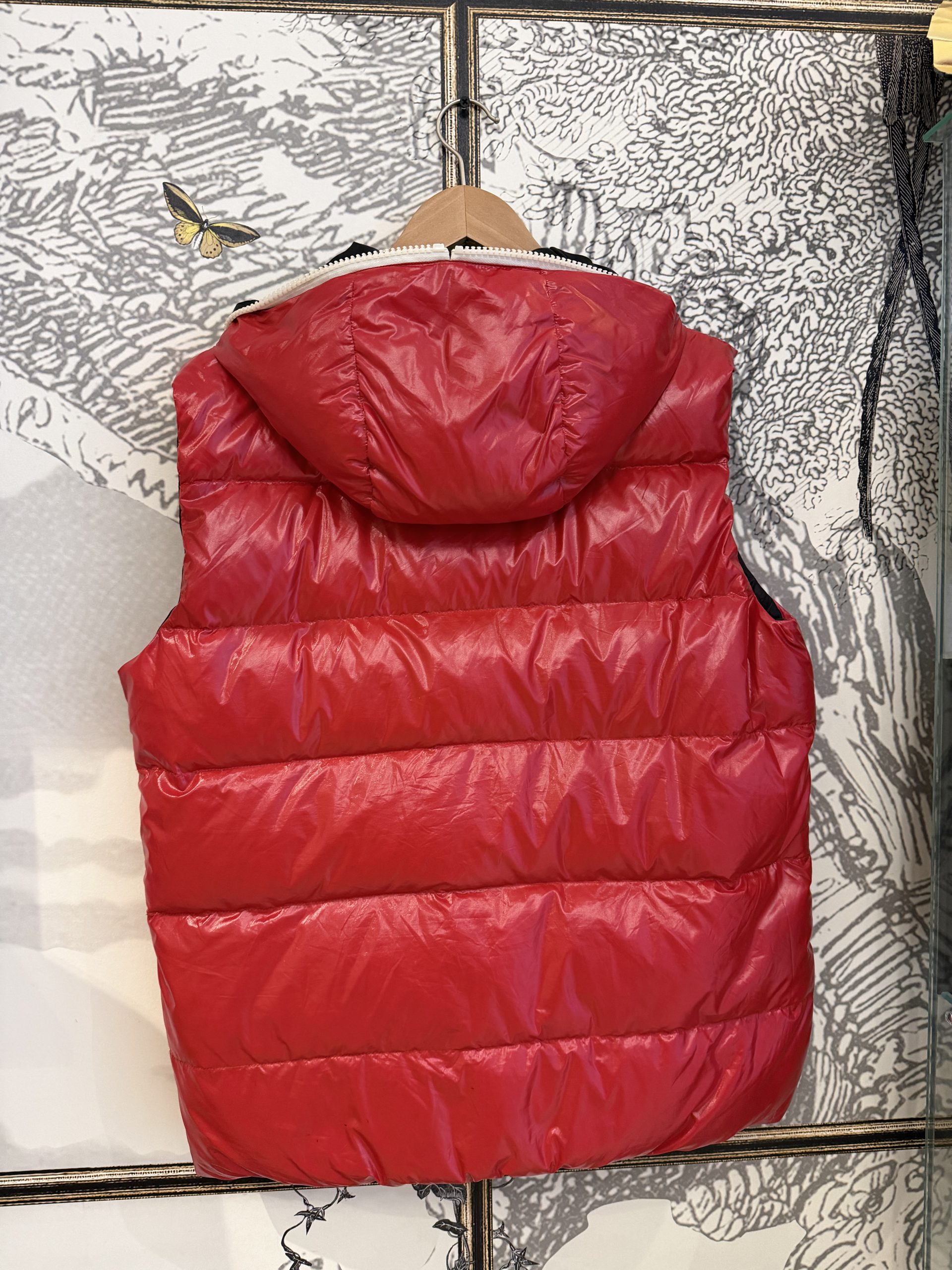 Doudoune iconique Moncler sans manches. Nylon laqué rouge, matelassage en duvet, coupe droite. Fermeture zippée, poches zippées, badge Moncler poitrine. Pièce intemporelle et très recherchée.