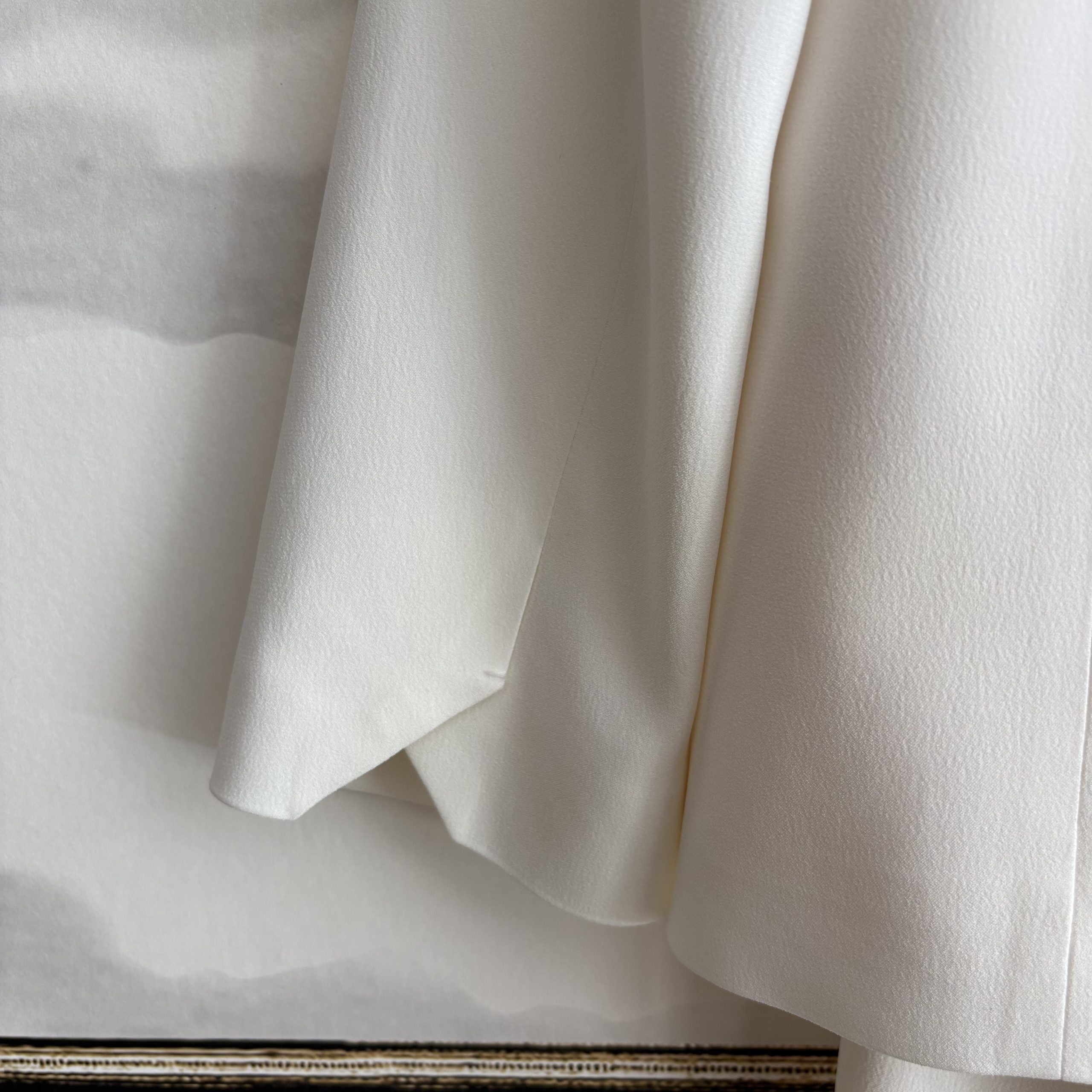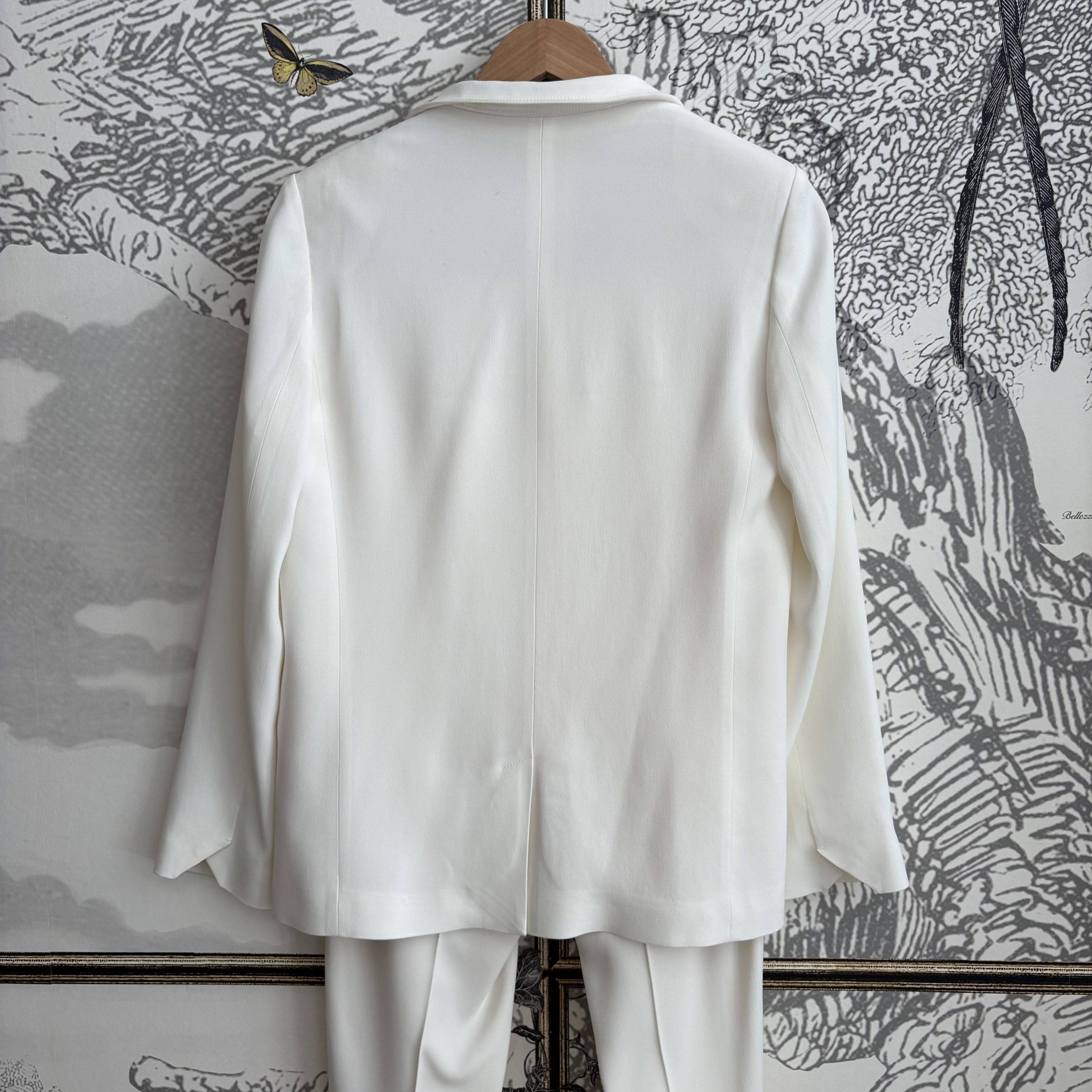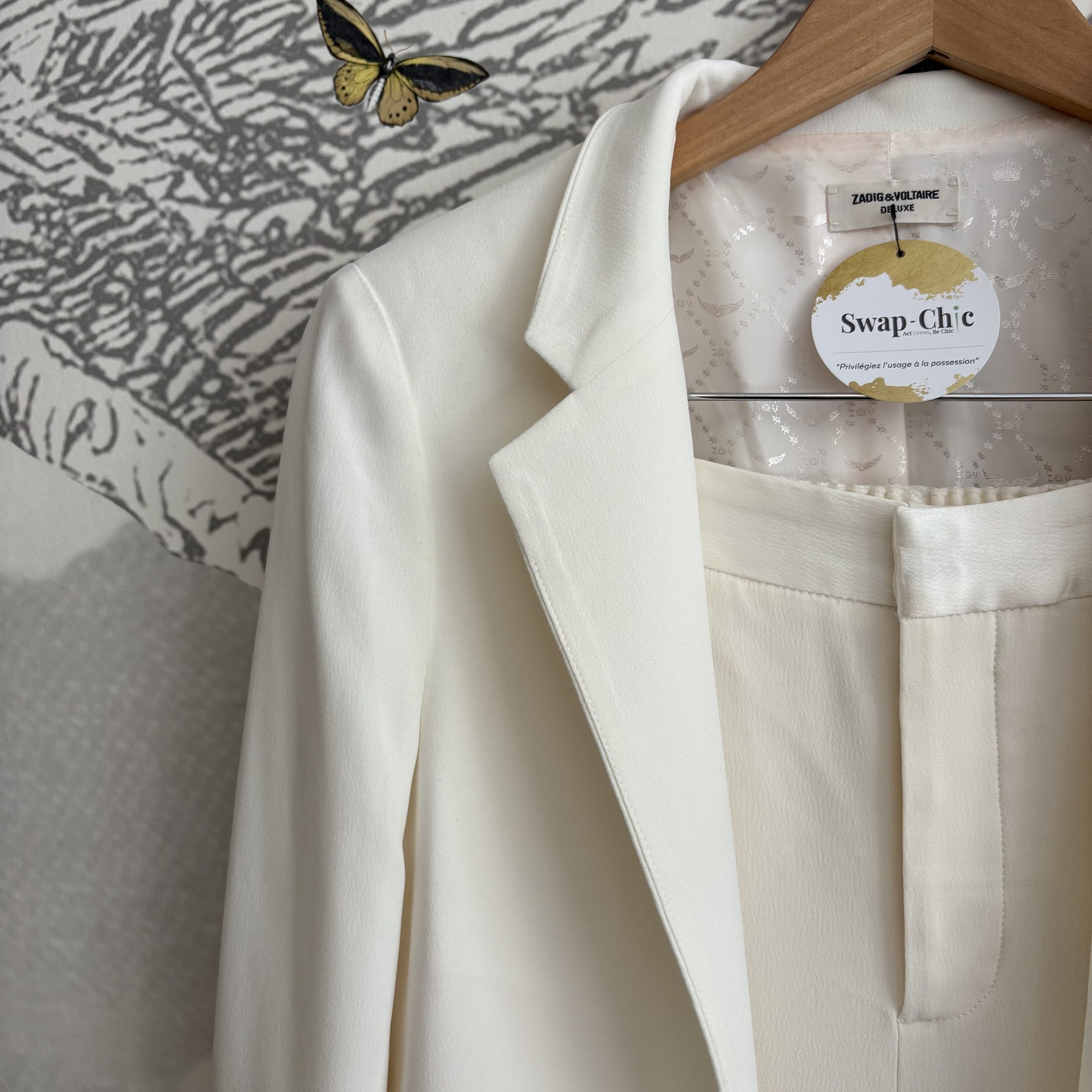Composé d’un pantalon à la coupe droite et d’un blazer sans fermeture. Teinte blanc écru rehaussée de détails satinés pour une allure chic et contemporaine