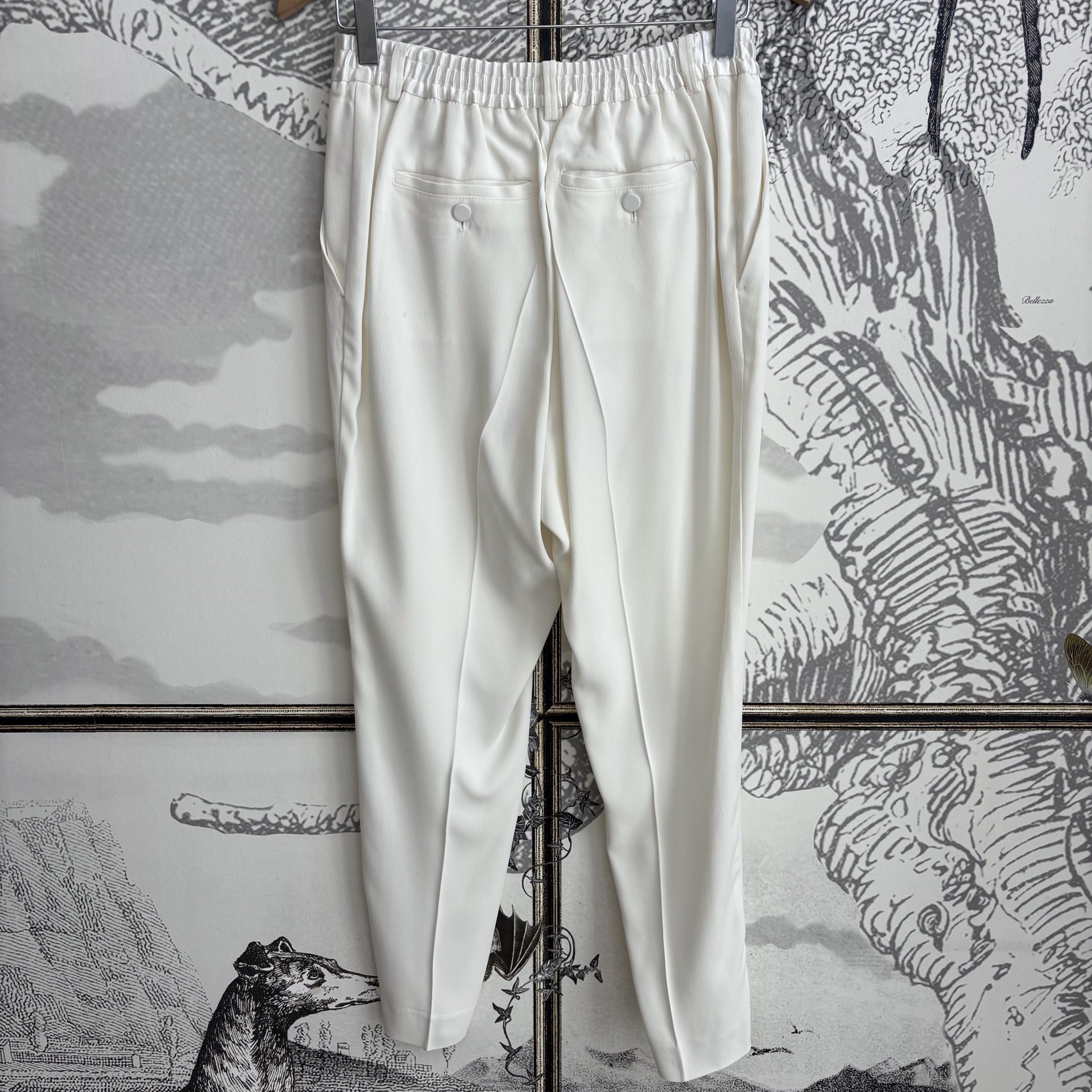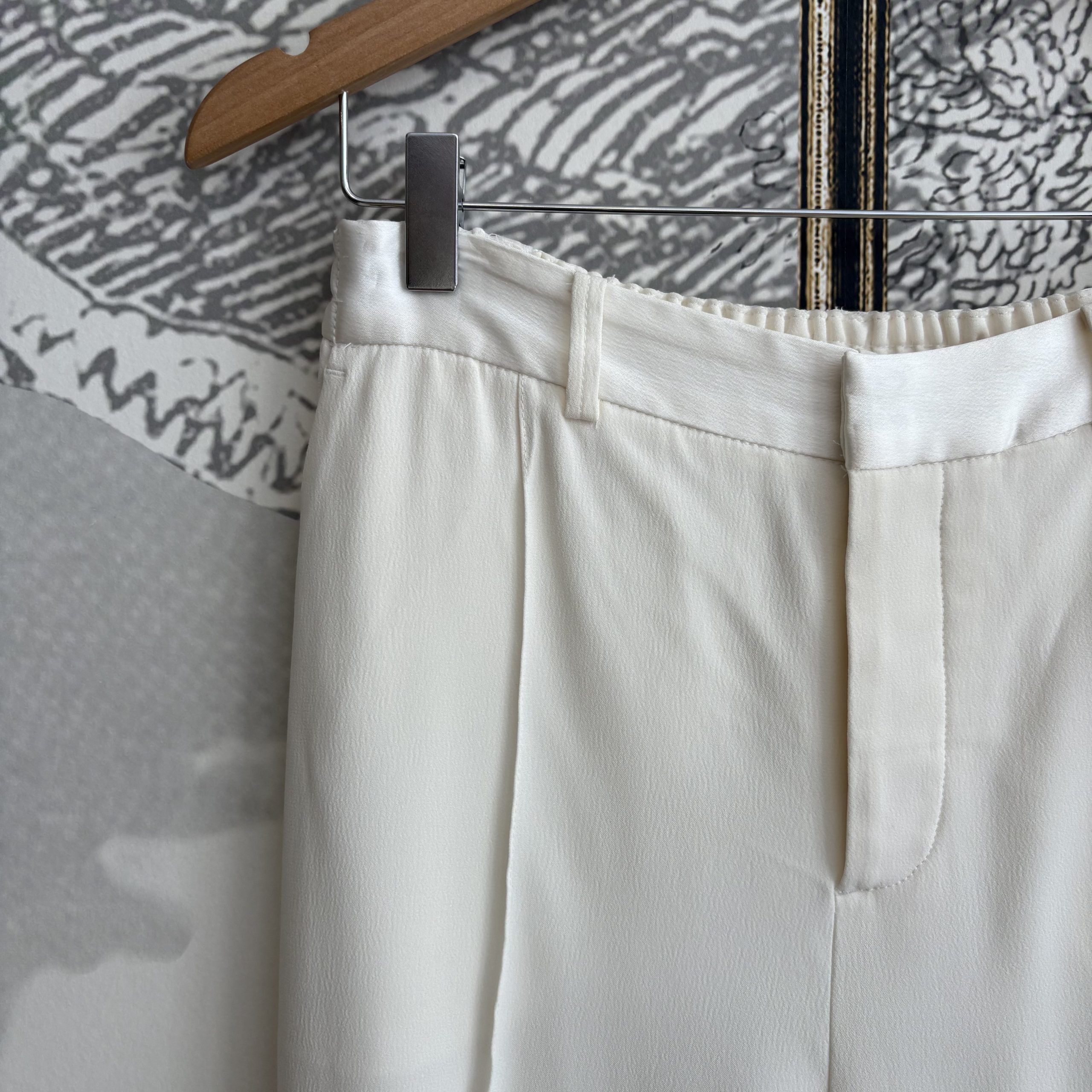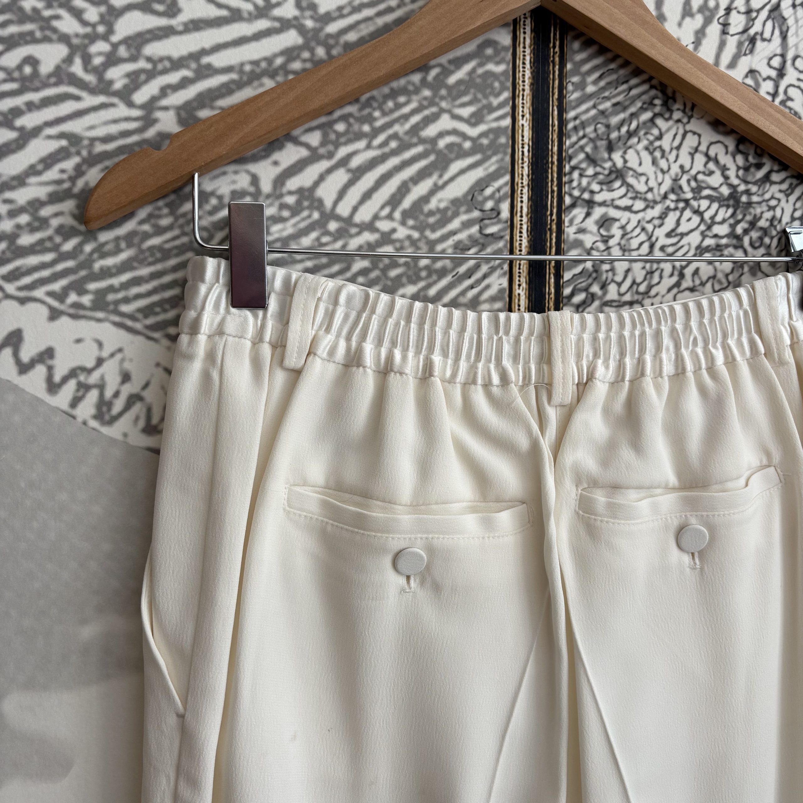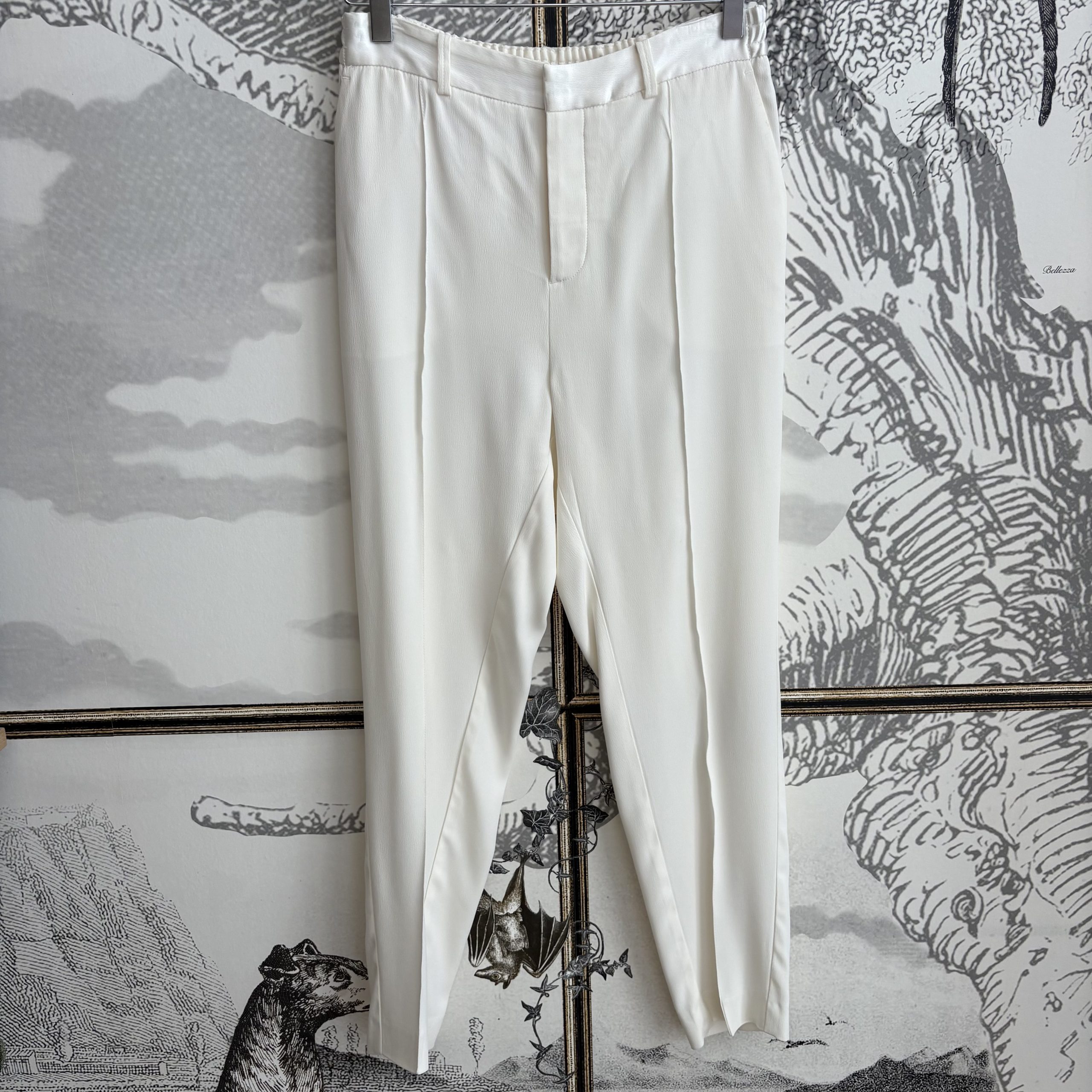 Composé d’un pantalon à la coupe droite et d’un blazer sans fermeture. Teinte blanc écru rehaussée de détails satinés pour une allure chic et contemporaine