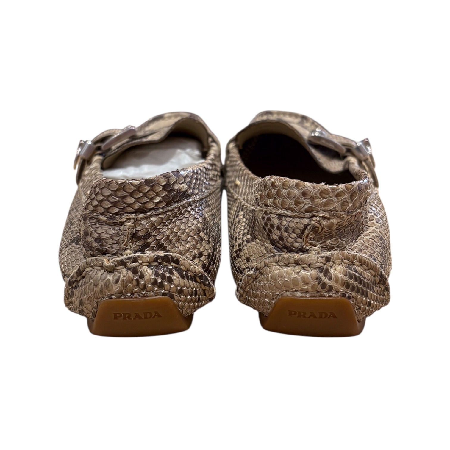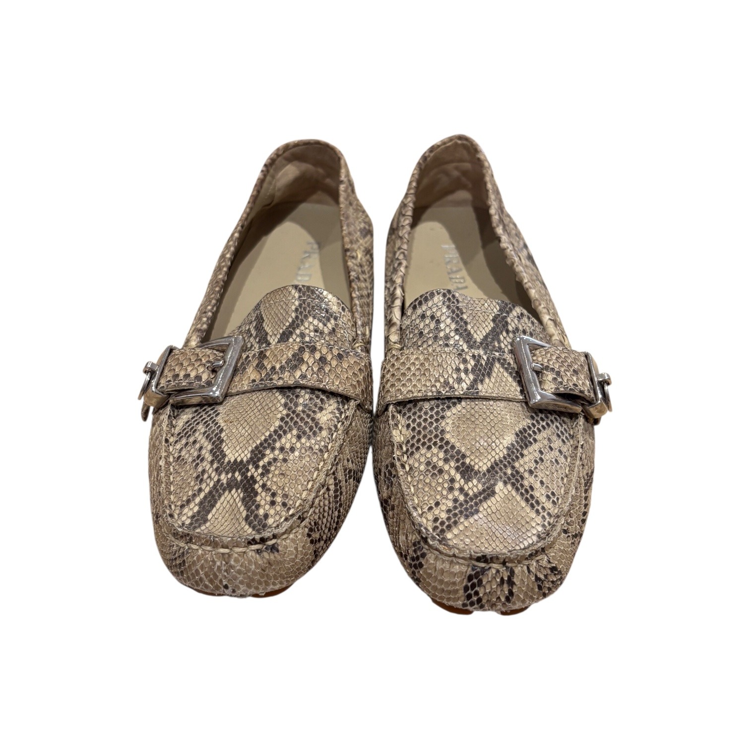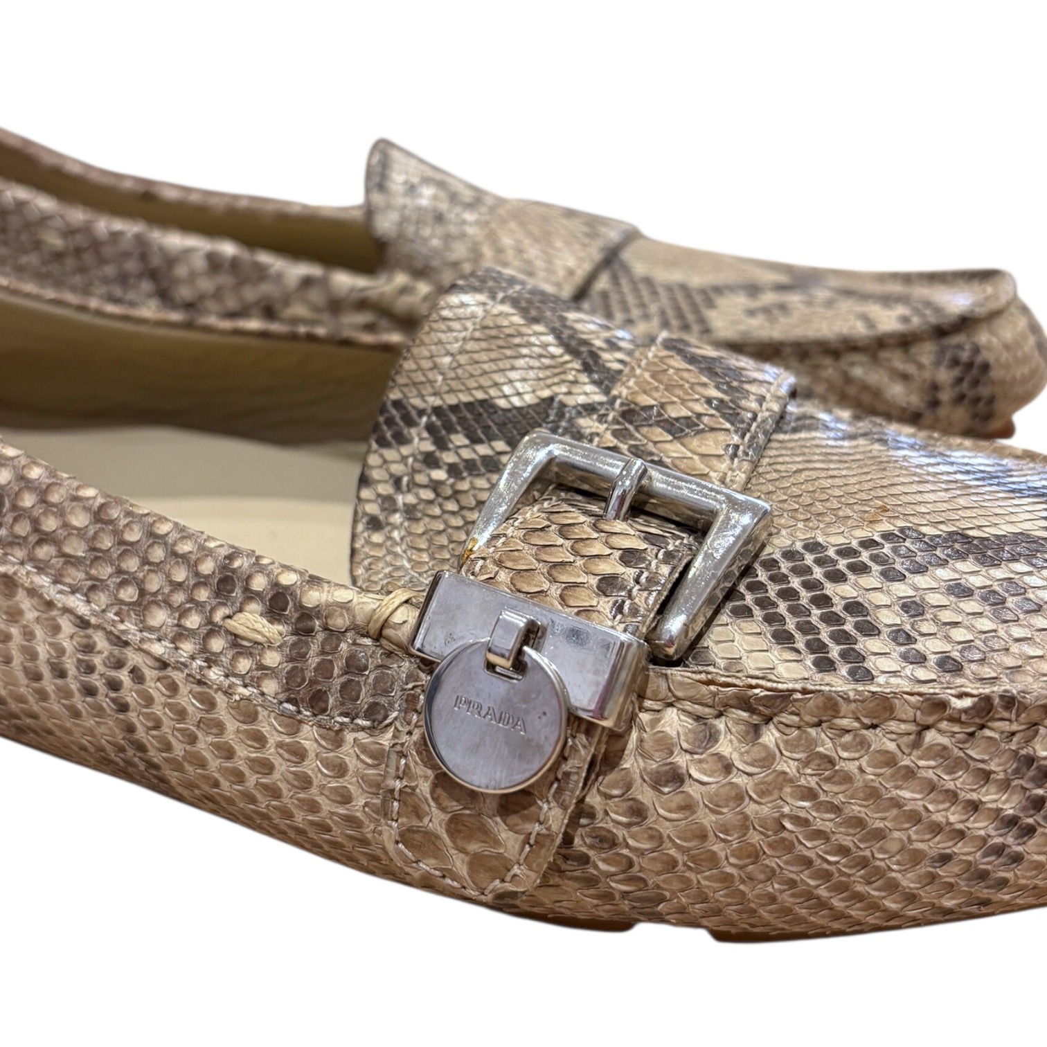 Réalisés en cuir exotique python dans des tons naturels. Leur silhouette classique est réhaussée d’une boucle argentée et d’un médaillon gravé Prada. Souples et confortables, ces mocassins sont parfaits pour un look casual chic ou habillé