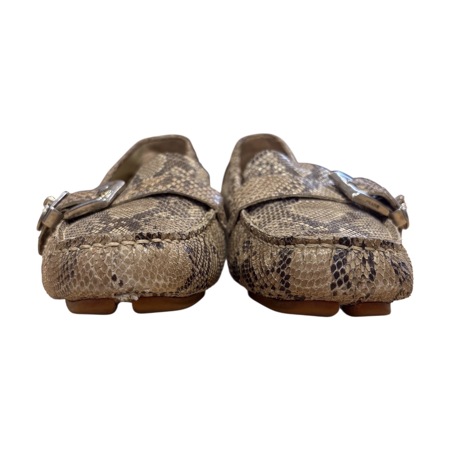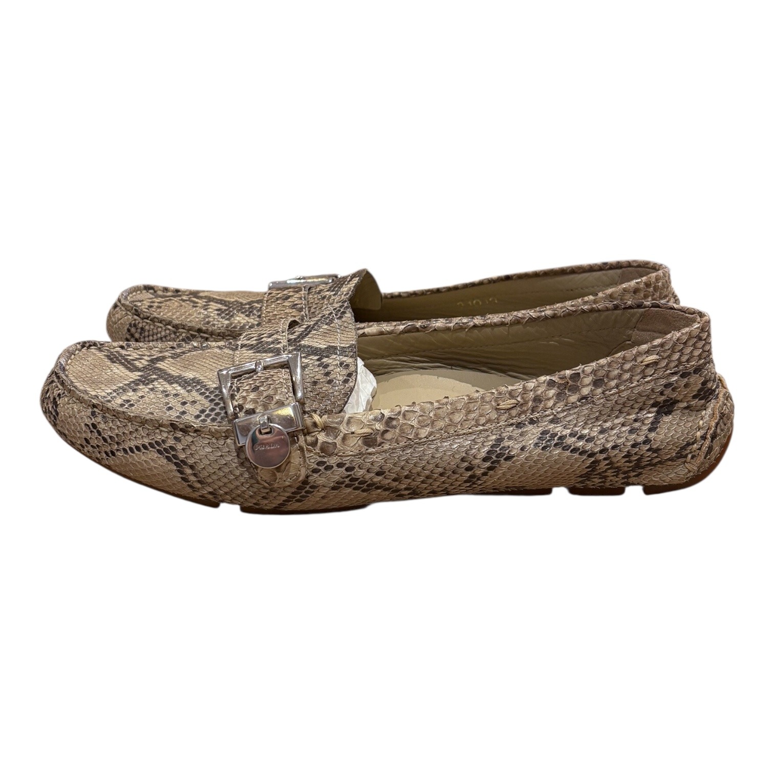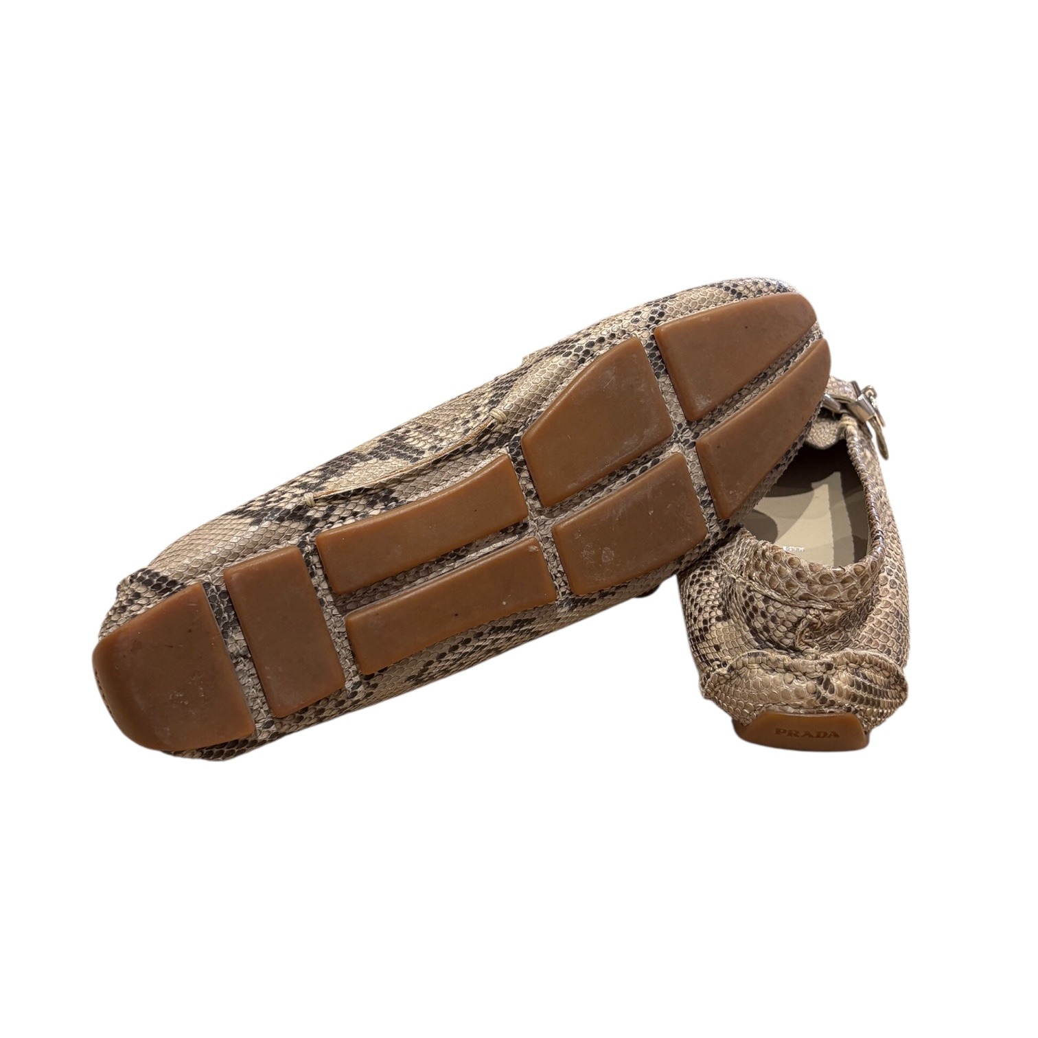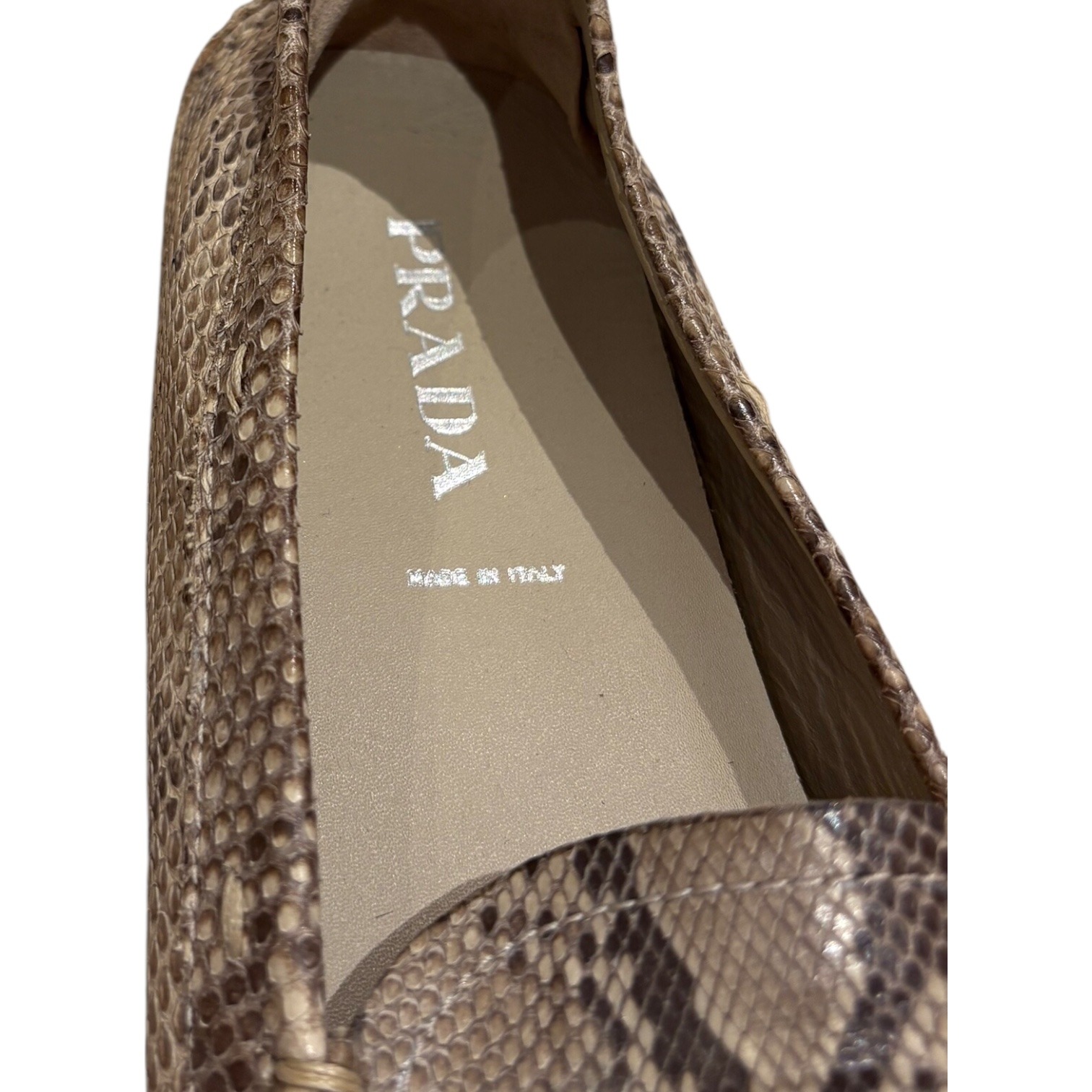 Réalisés en cuir exotique python dans des tons naturels. Leur silhouette classique est réhaussée d’une boucle argentée et d’un médaillon gravé Prada. Souples et confortables, ces mocassins sont parfaits pour un look casual chic ou habillé
