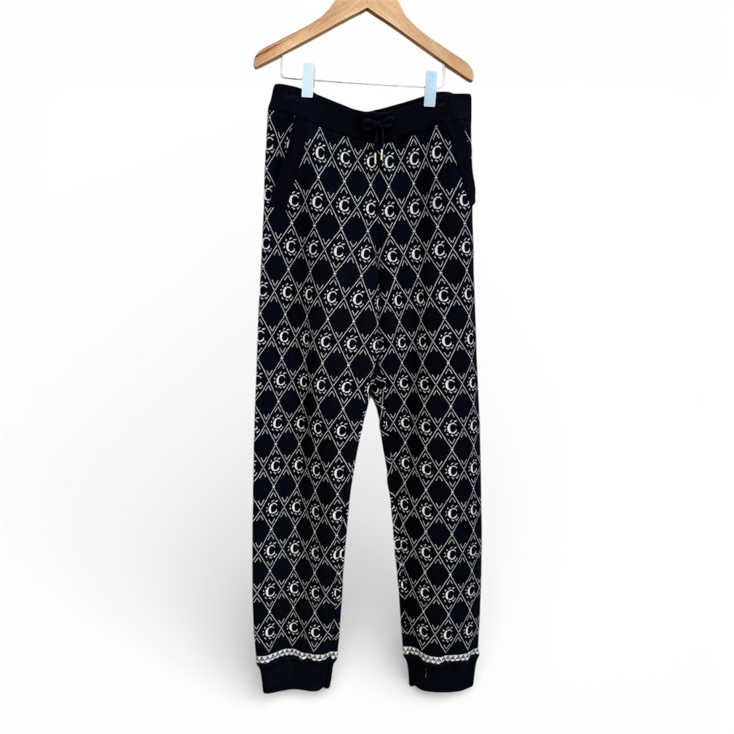 Pantalon enfant Chloé en maille bleu marine. Motif monogrammé iconique sur l’ensemble de la pièce. Taille élastique avec cordon de serrage pour plus de confort. Coupe droite et agréable à porter. Finitions côtelées en bas de jambe. Un pantalon chic et moderne, parfait pour un look élégant au quotidien.