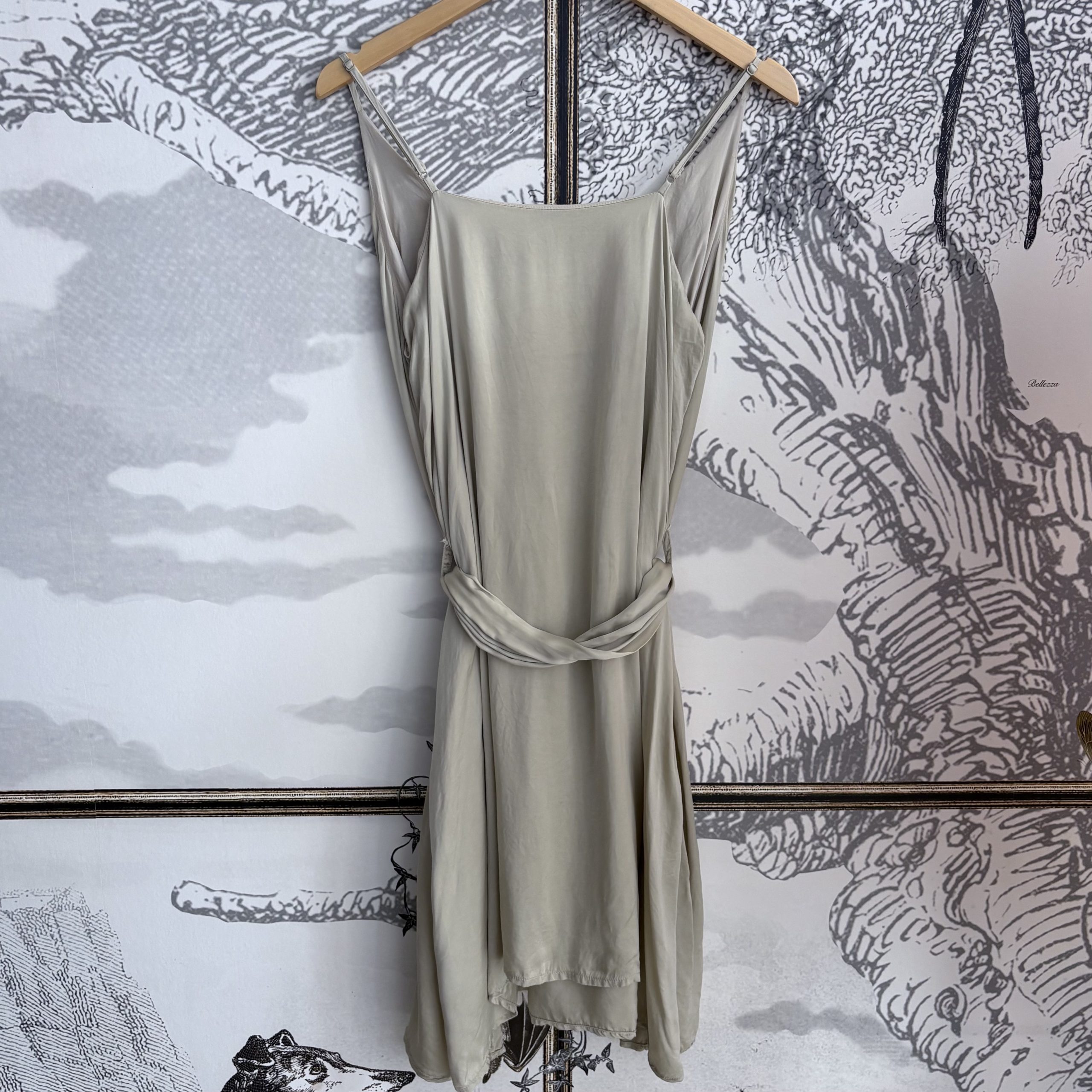 100% en cupro, à la texture fluide et à l’élégant effet satiné, dans une douce teinte crème. Elle se resserre à la taille grâce à une ceinture à nouer façon nœud papillon et dispose de fines bretelles ajustables pour un maintien délicat