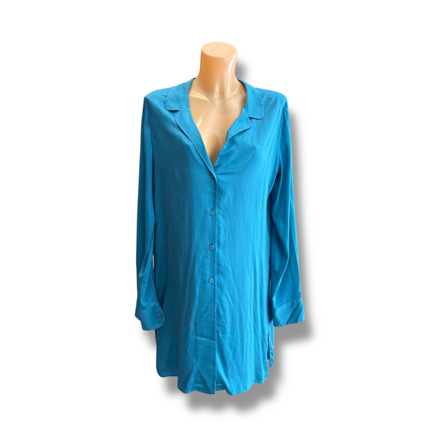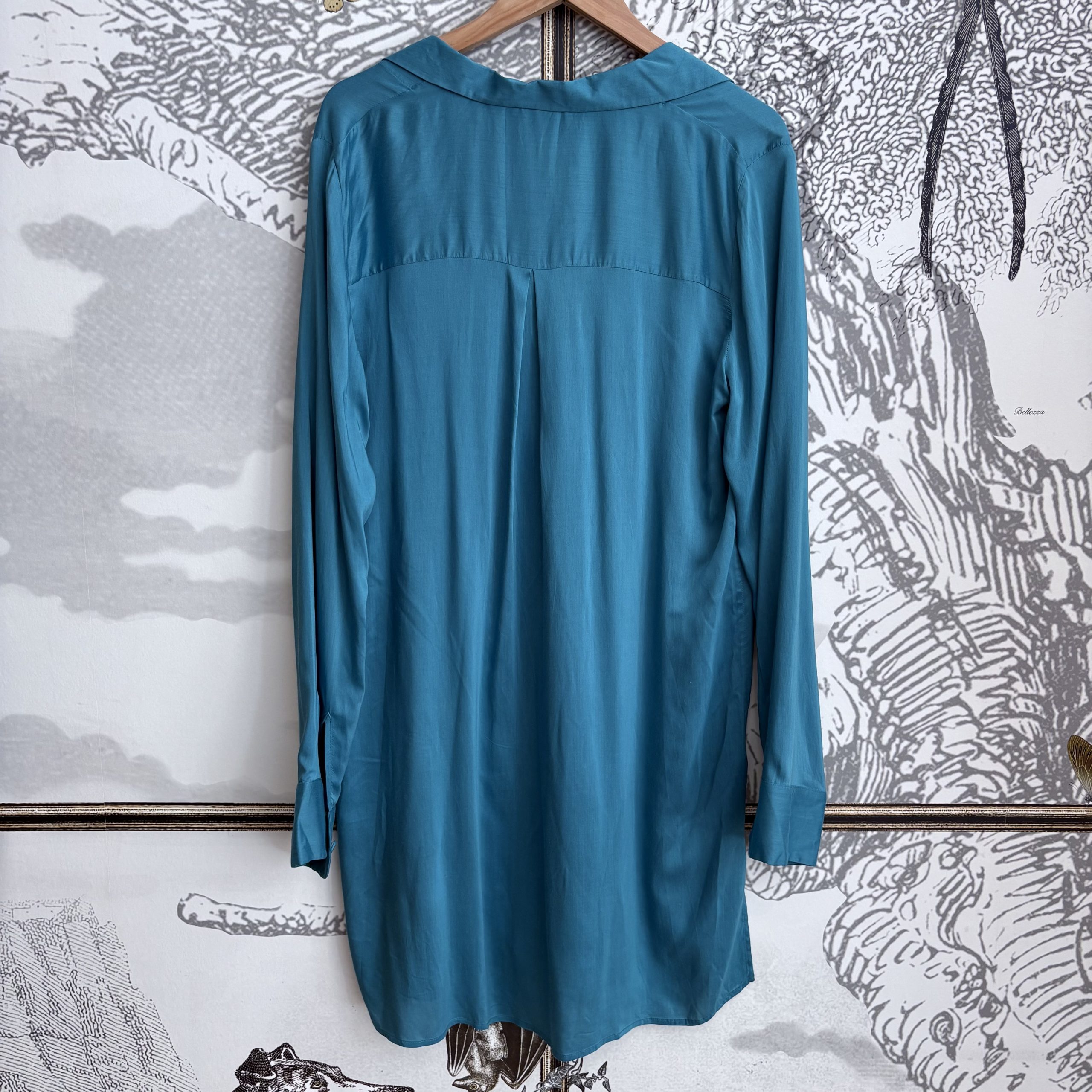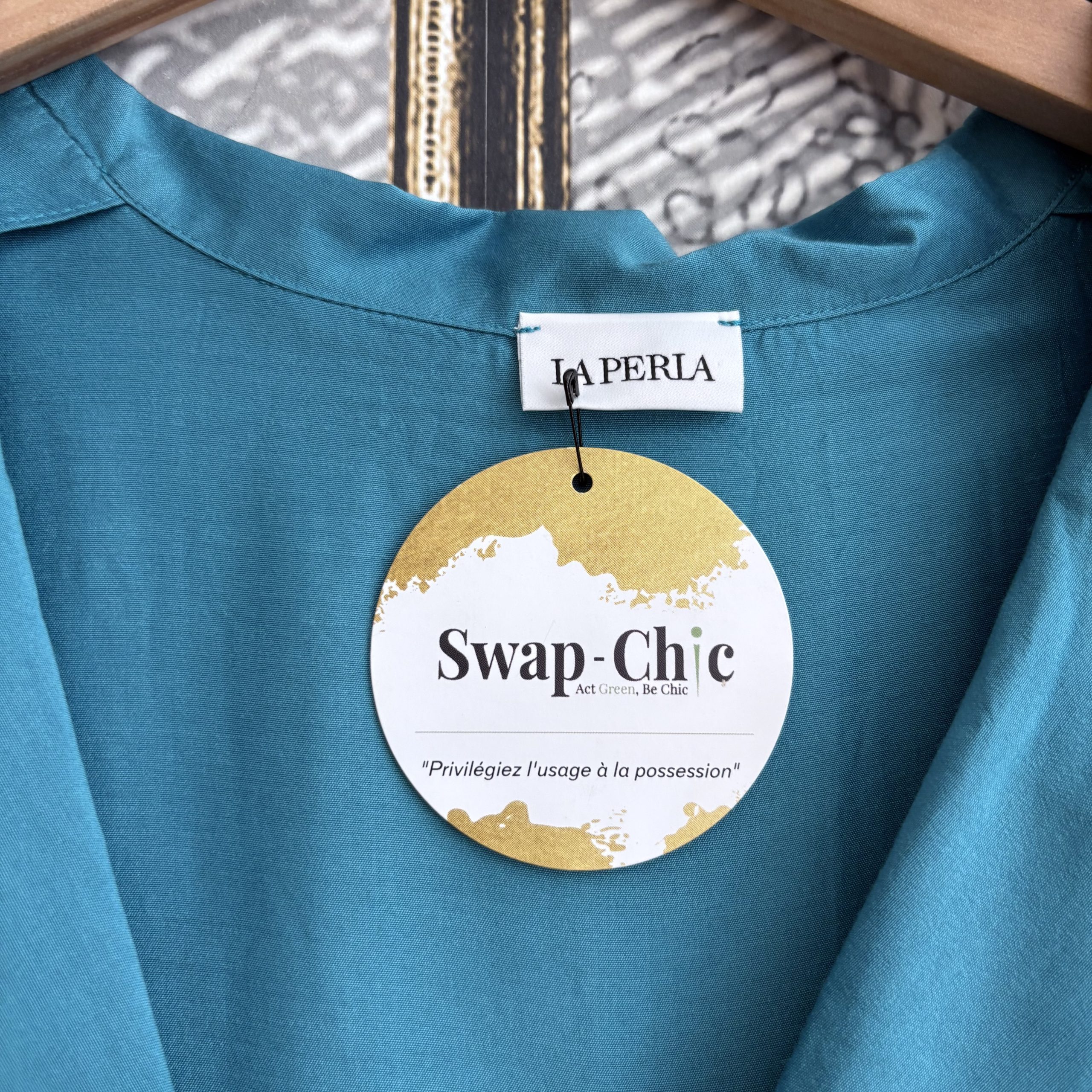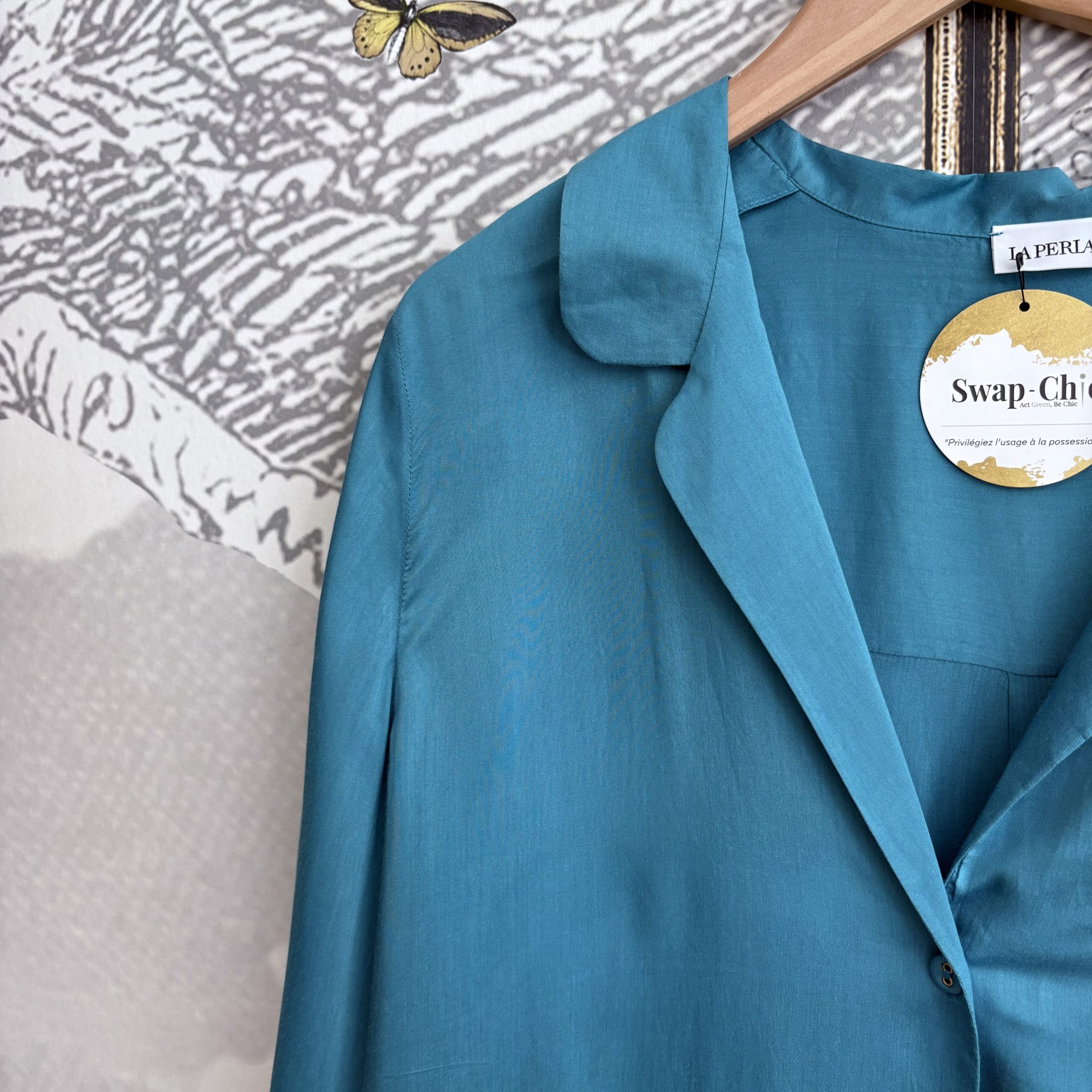 Dans une teinte bleu turquoise éclatante, confectionnée dans une matière fluide, elle offre un tombé léger et agréable à porter.