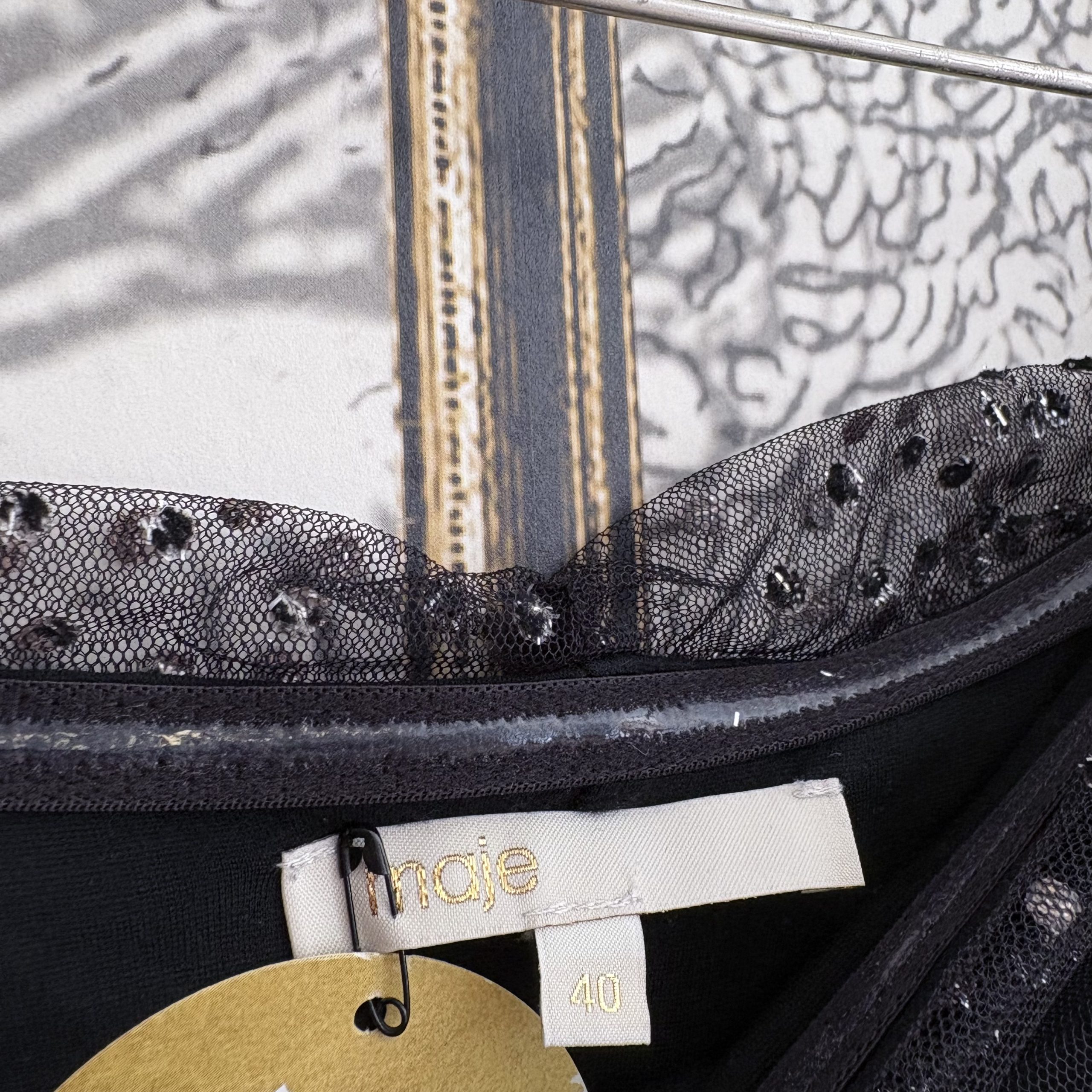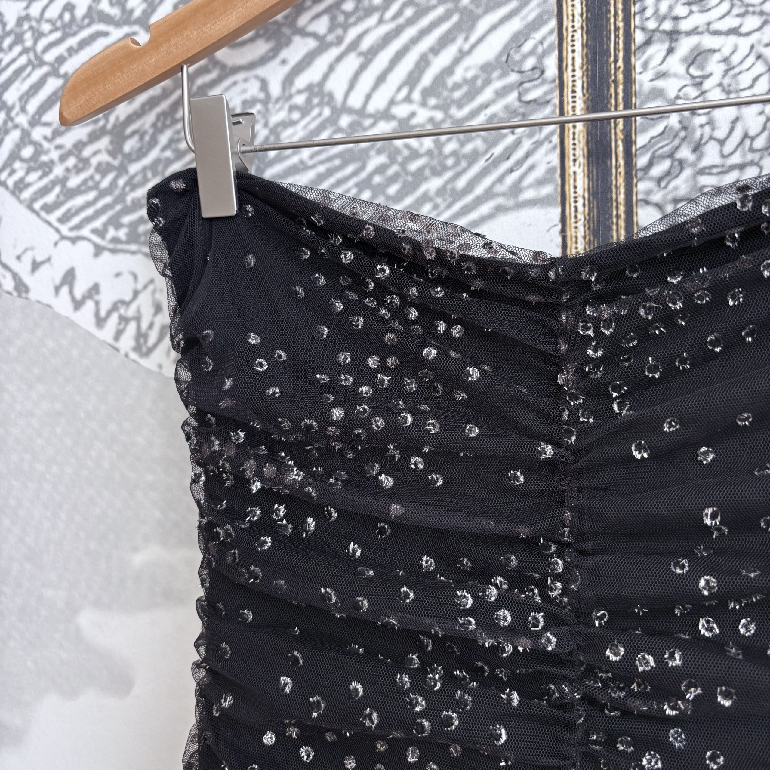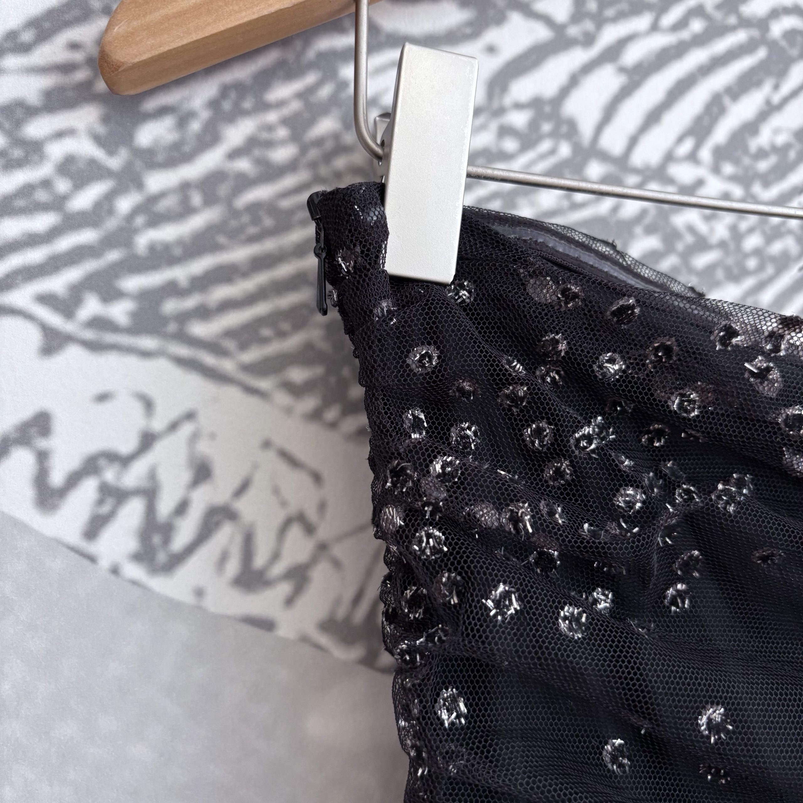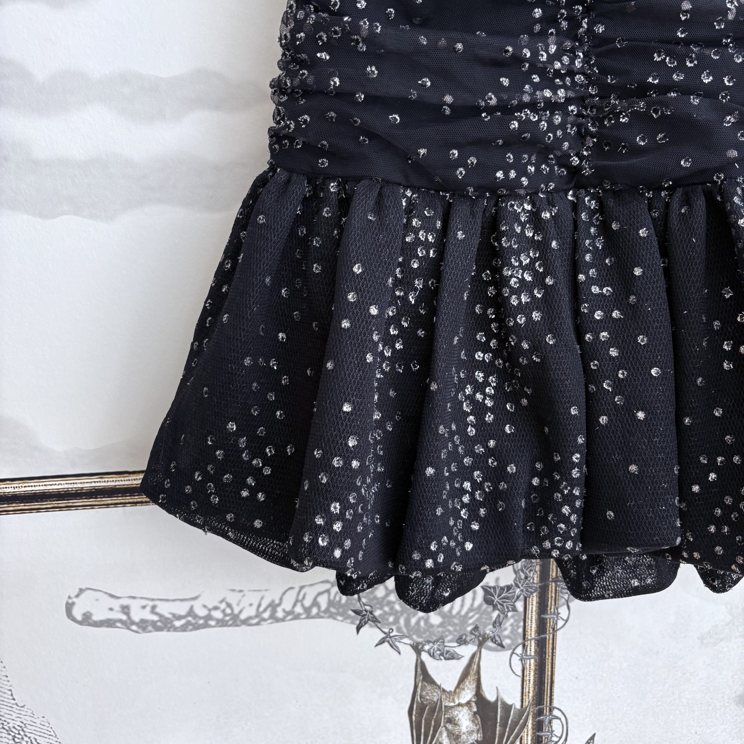 Le haut structuré épouse délicatement la silhouette, tandis que la jupe évasée apporte volume et légèreté. Confectionnée dans une toile noire élégante, elle est ornée de motifs argentés qui captent la lumière avec subtilité