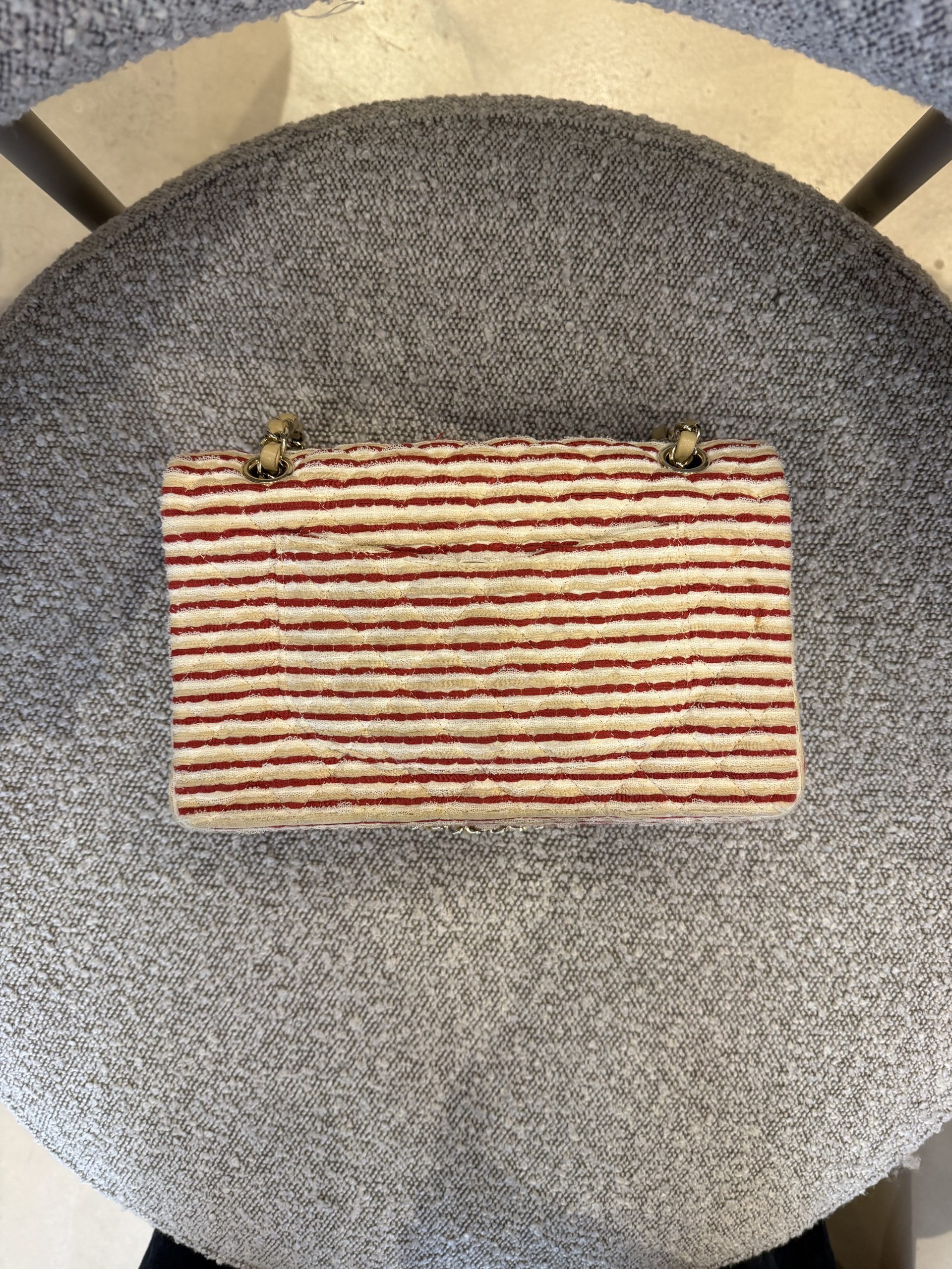 Confectionné en tweed rouge et blanc, signature de la maison.
