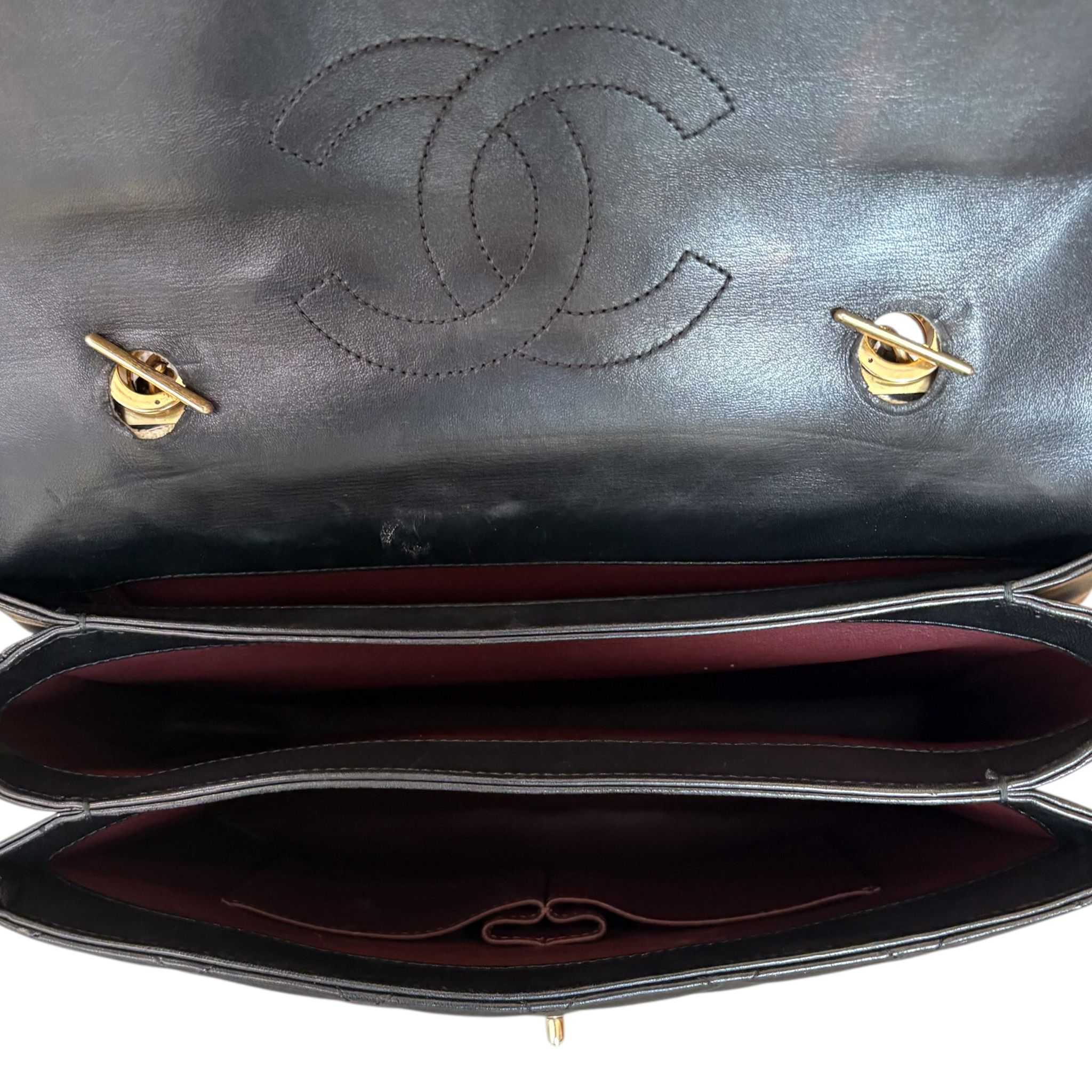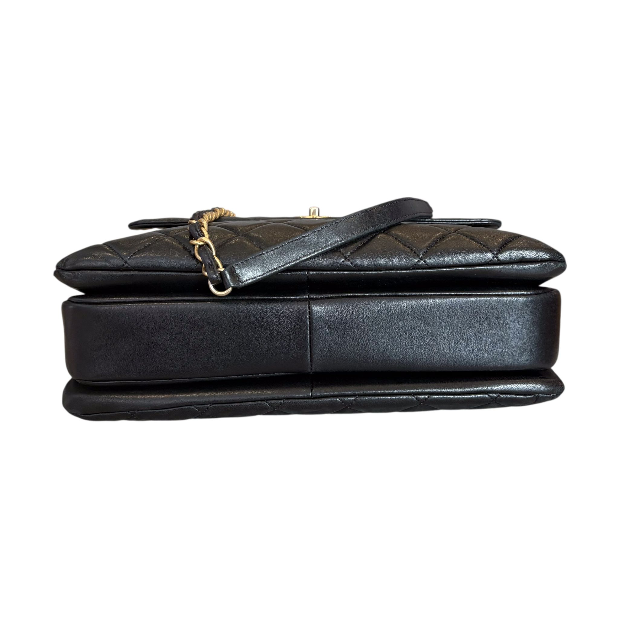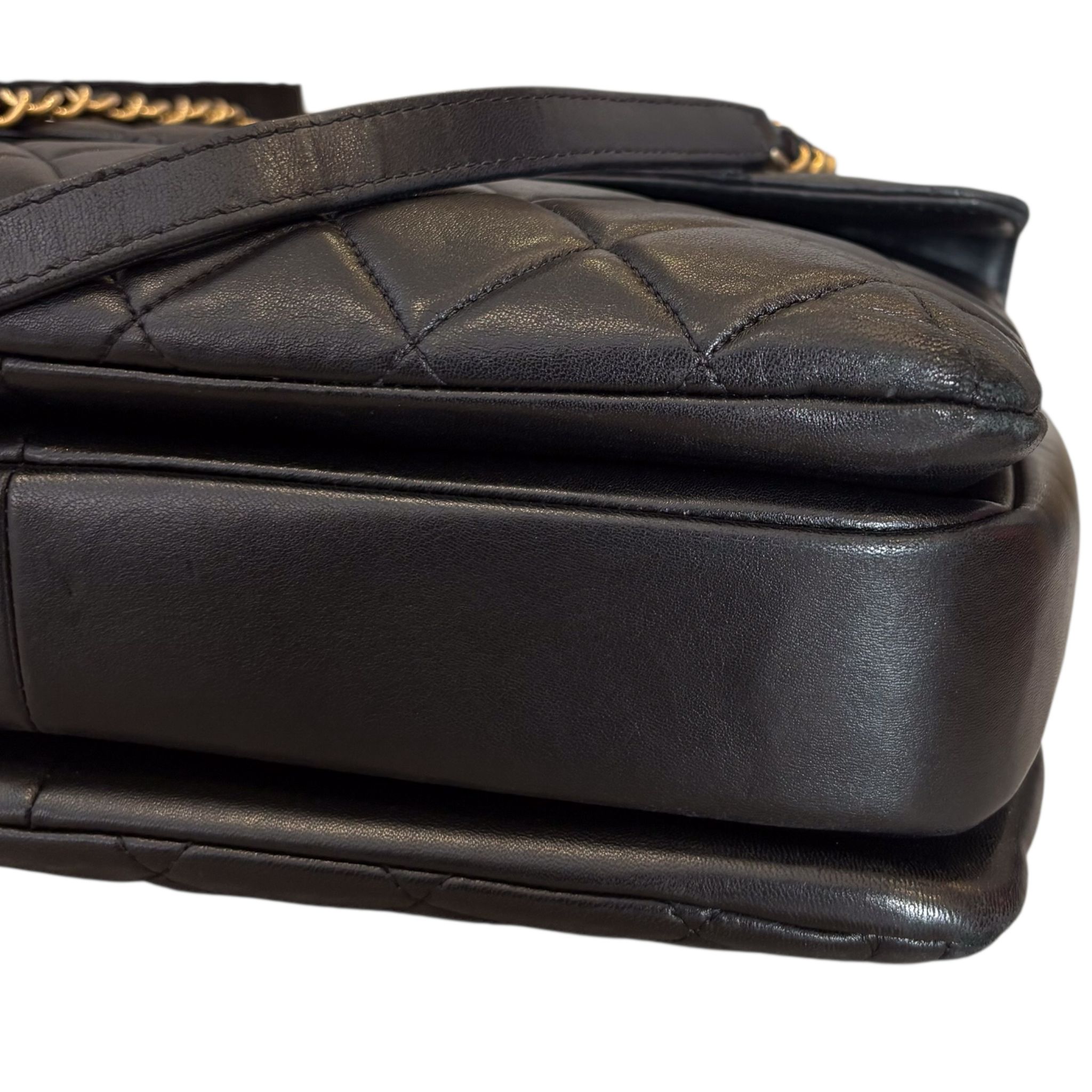 En cuir noir matelassé noir et sa anse classique en corde enfilée dans une chaîne permettant de le porter à l’épaule ou en bandoulière. Fermeture à rabat ornée du logo de la marque, une poche extérieure au dos et intérieur avec plusieurs compartiments
