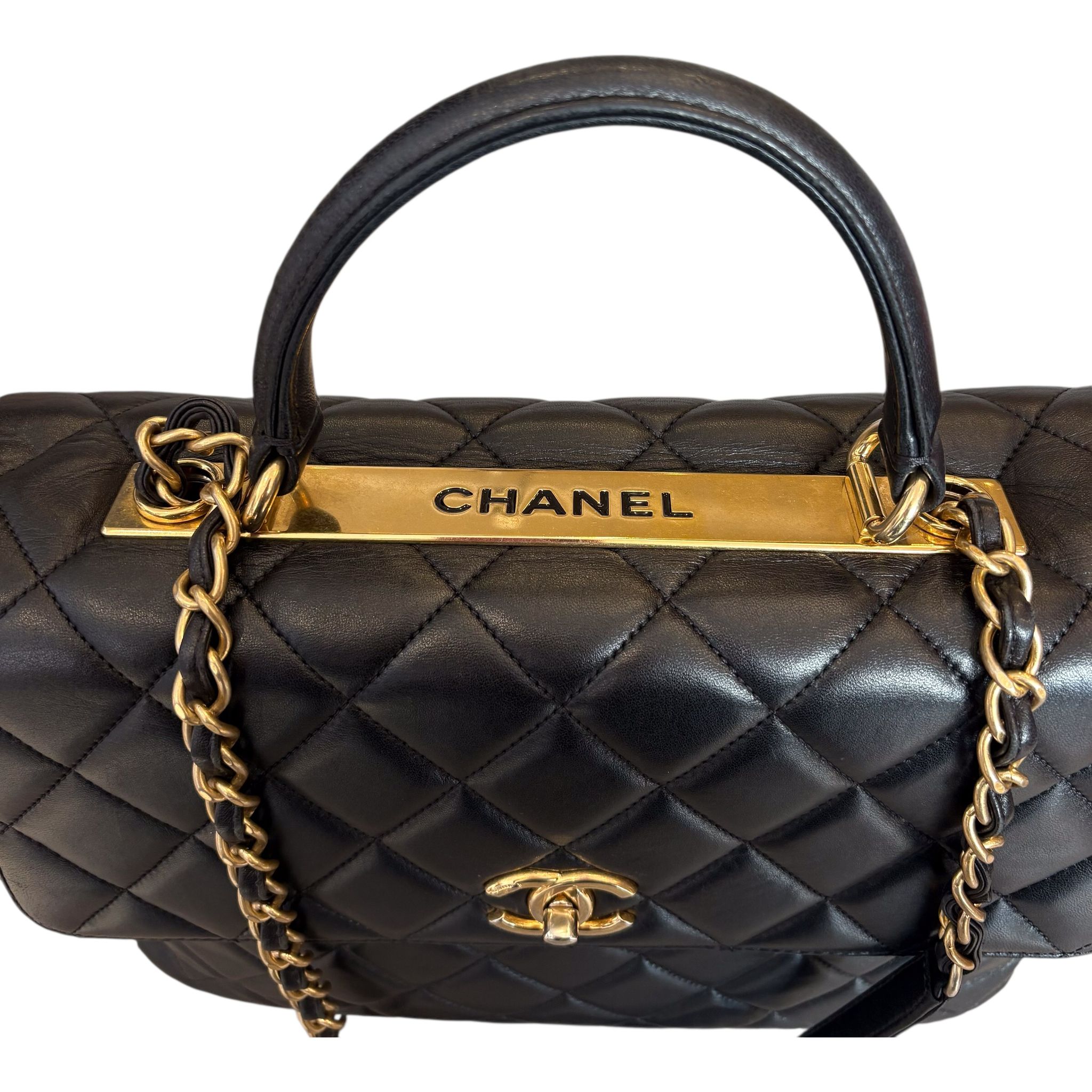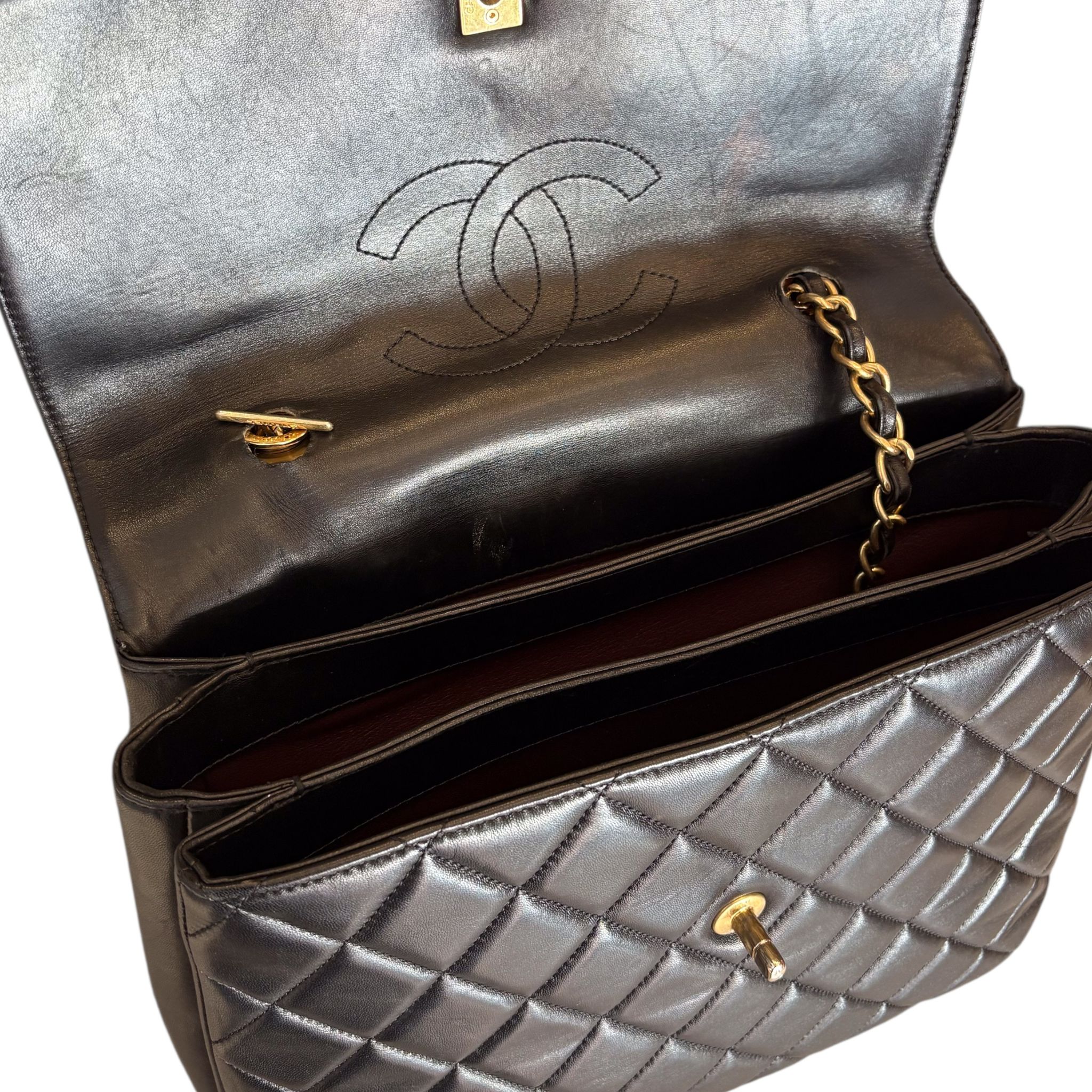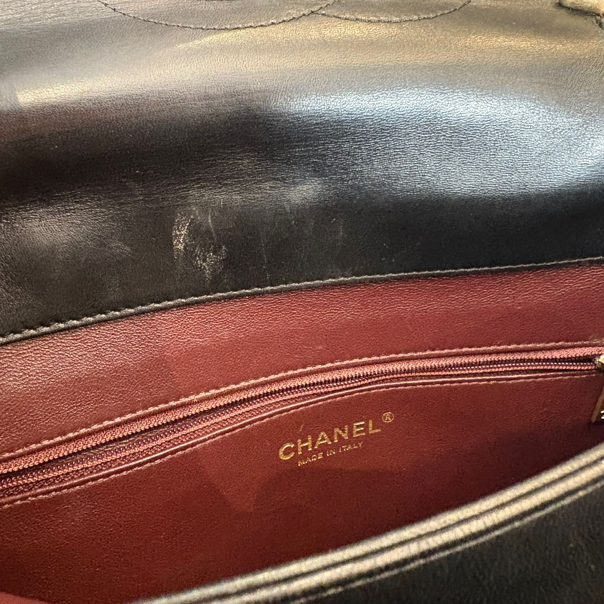 En cuir noir matelassé noir et sa anse classique en corde enfilée dans une chaîne permettant de le porter à l’épaule ou en bandoulière. Fermeture à rabat ornée du logo de la marque, une poche extérieure au dos et intérieur avec plusieurs compartiments