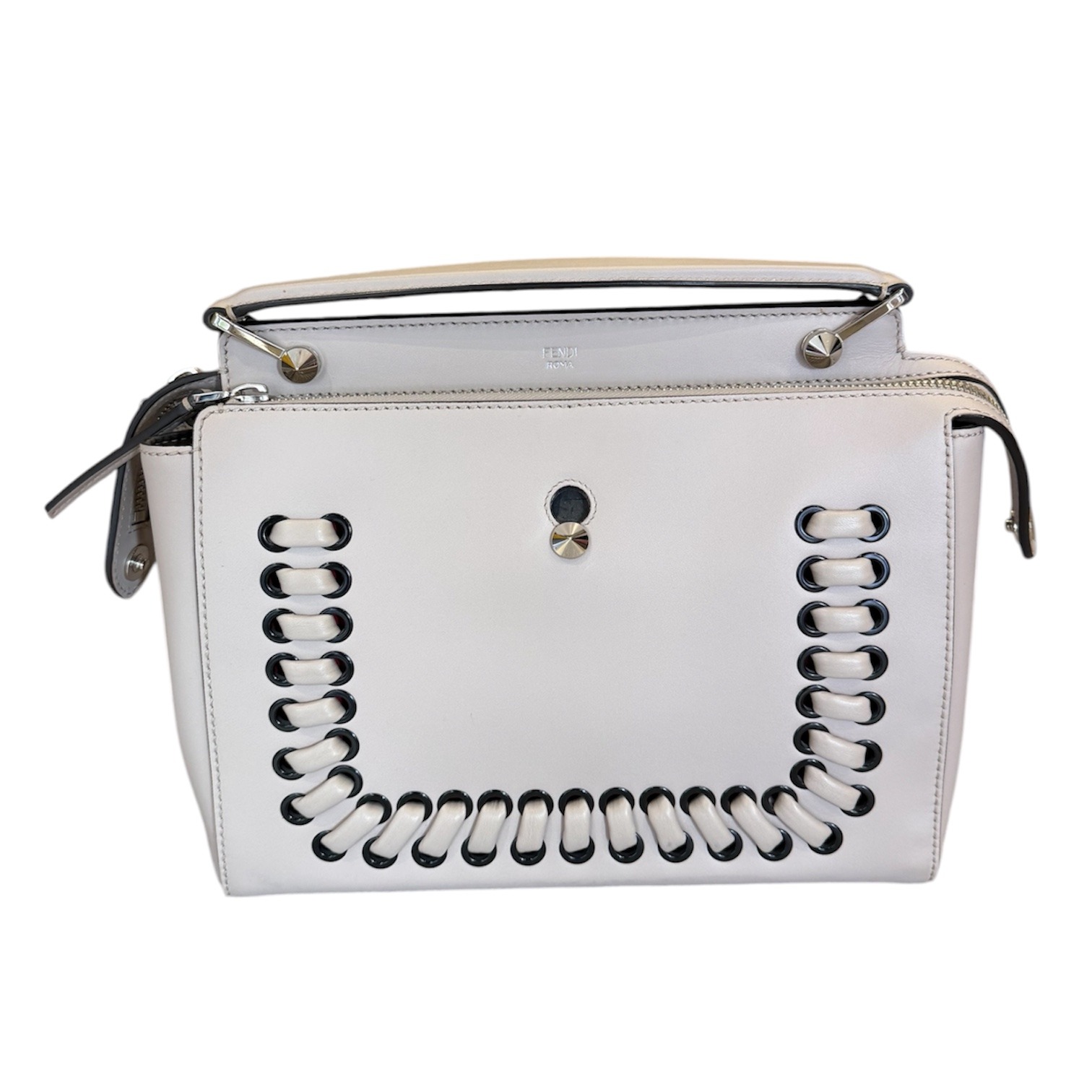 Sac Fendi DotCom Click en cuir beige avec détails lacés et finitions métalliques.