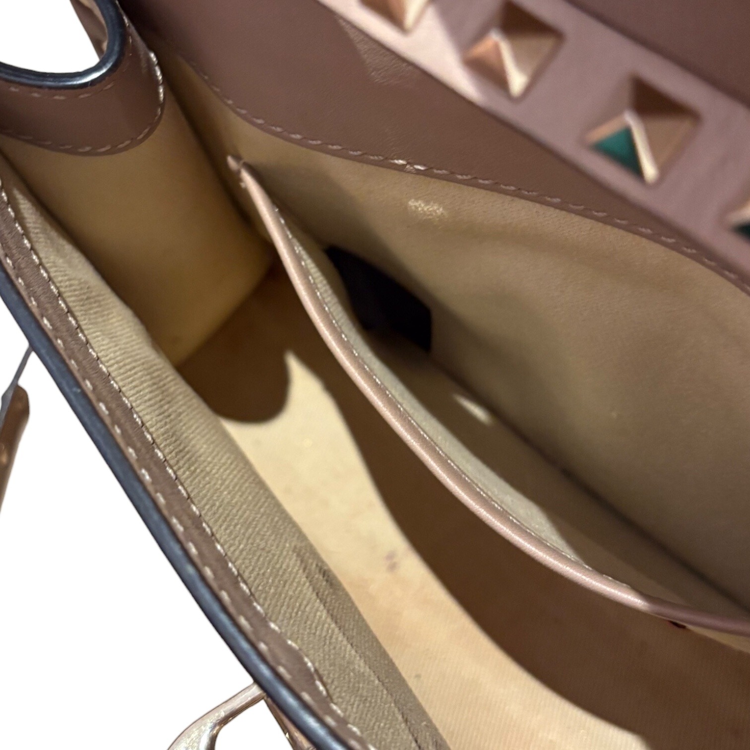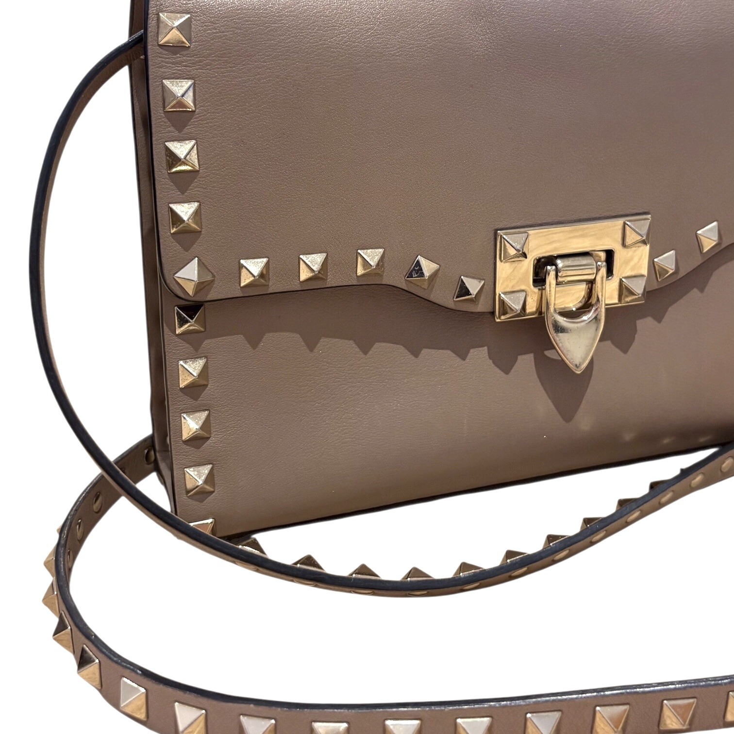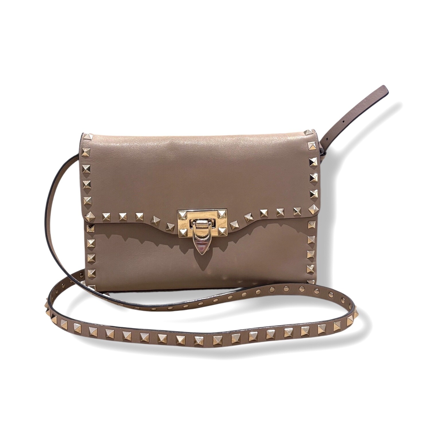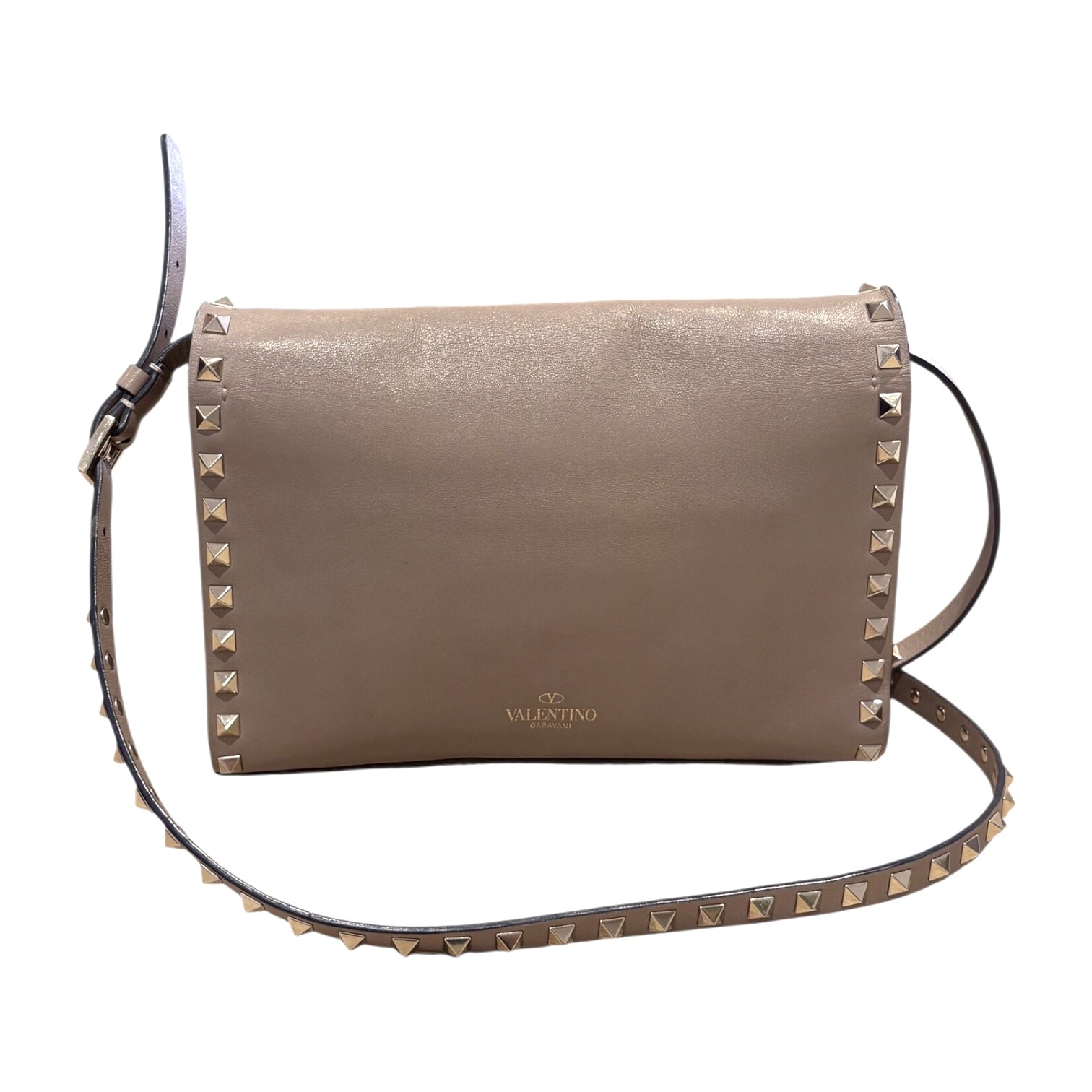 Réalisé en cuir lisse couleur rose poudré, sublimé par les clous pyramidaux dorés signature Rockstud, apposés à la main. Porté épaule ou croisé grâce à la bandoulière ajustable et amovible. Fermeture bijoux à rabat et doublure intérieur en tissu avec poche.