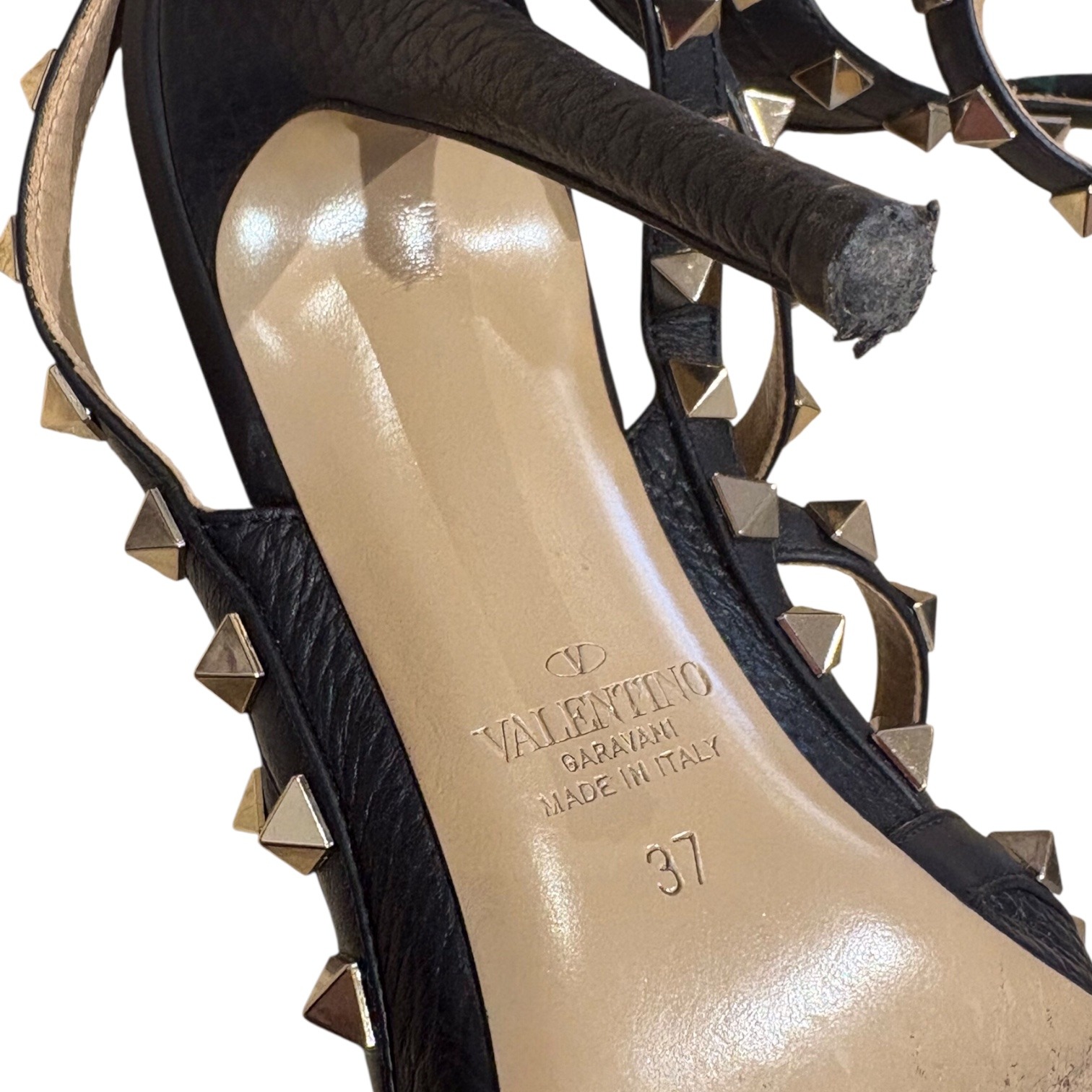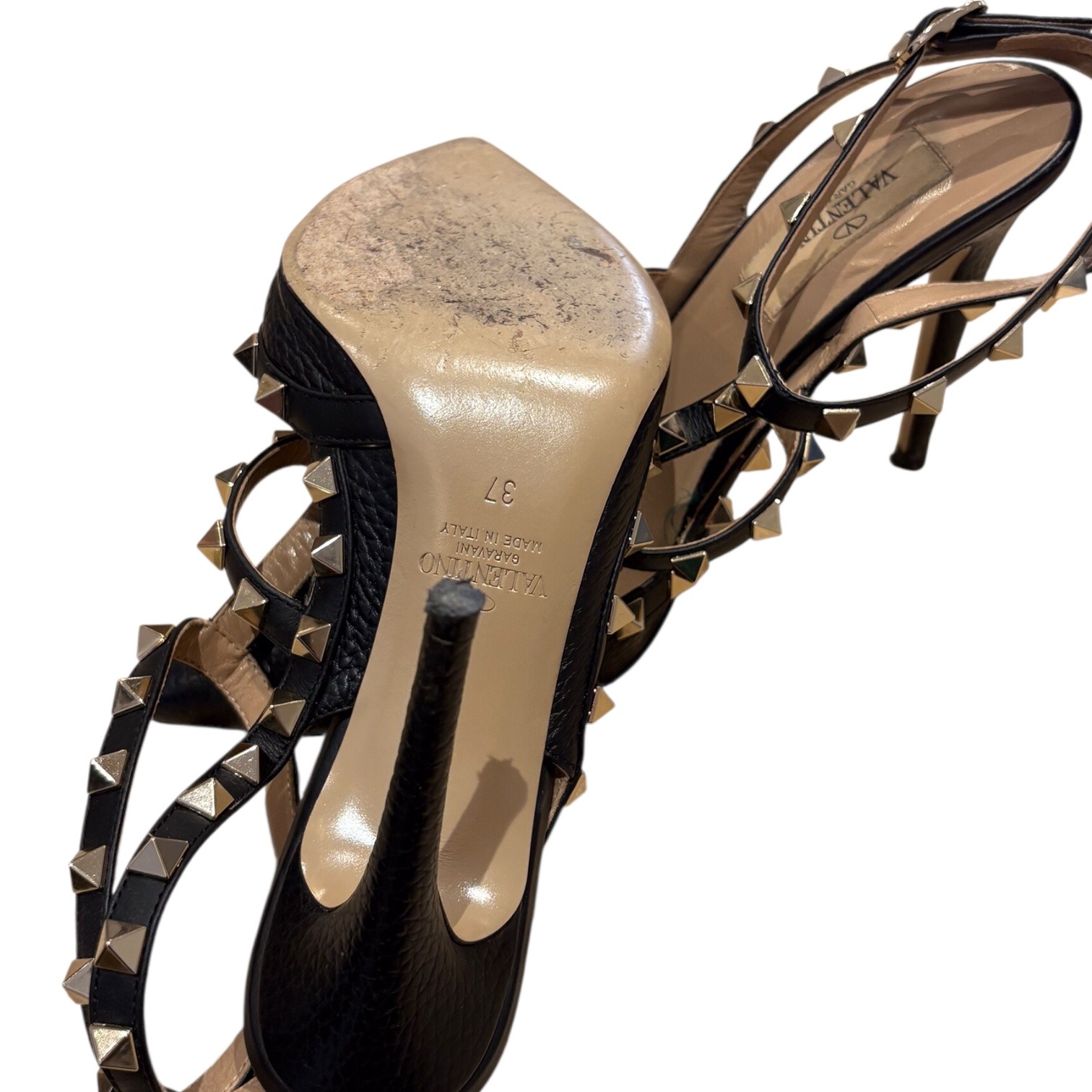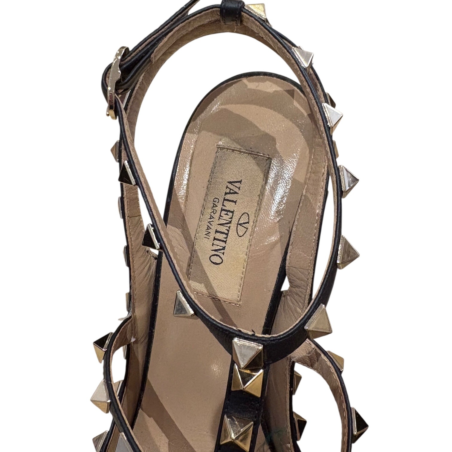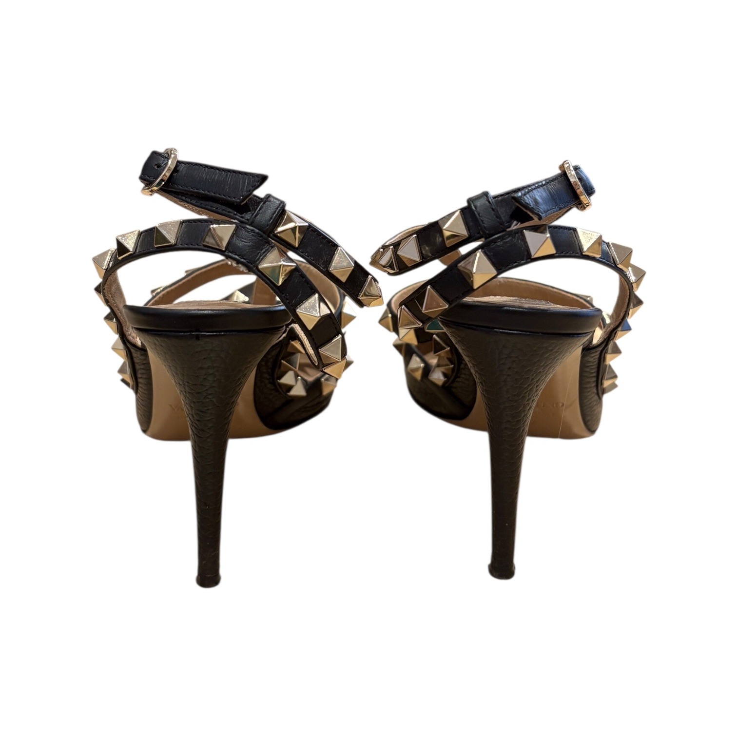Confectionnés en cuir noir grainé de qualité, à bout pointu pour une silhouette affûtée et féminine. Les brides multiples en cuir lisse noir sont ornées des célèbres clous pyramidaux dorés, signature audacieuse de la maison Valentino. Talon fin et courbe élégante