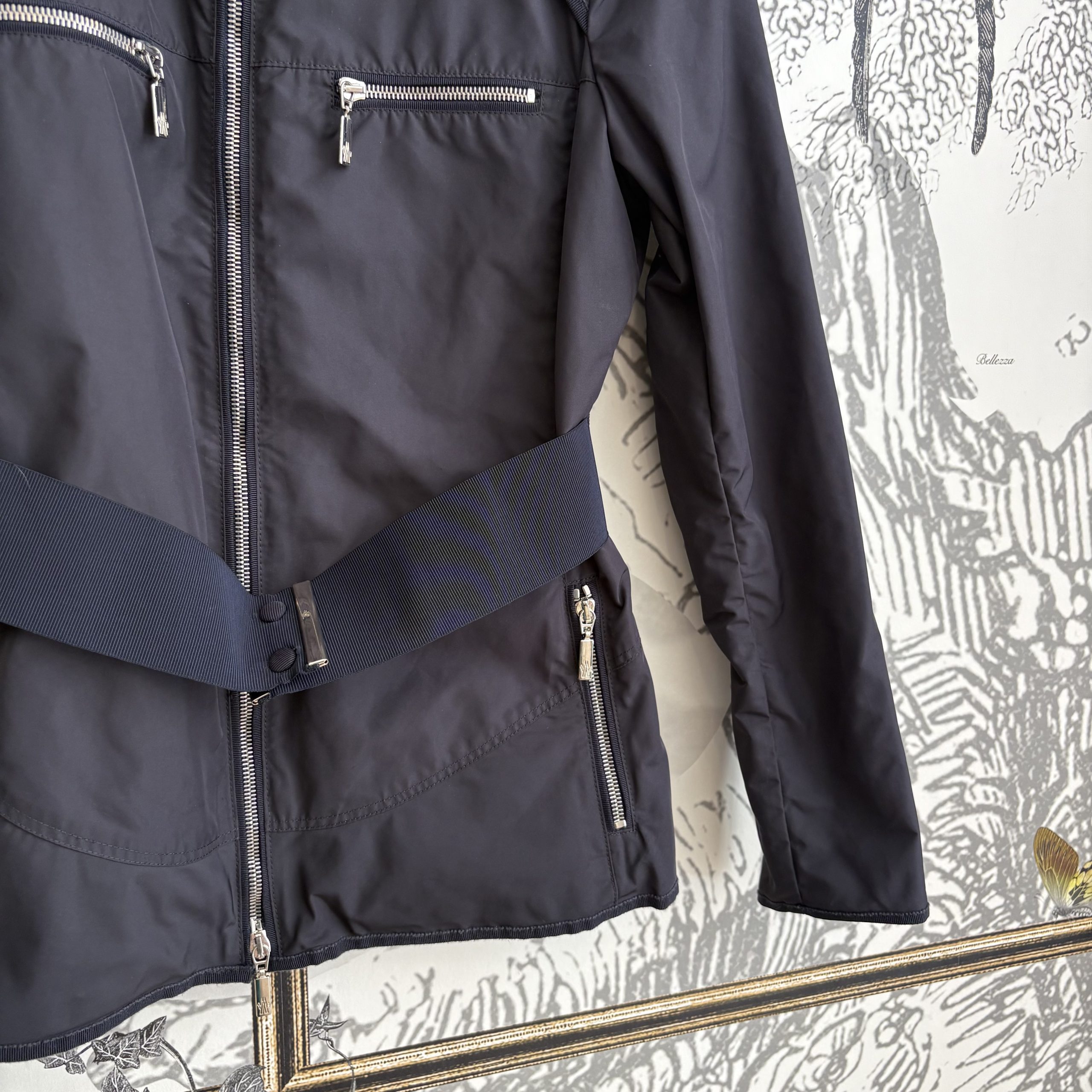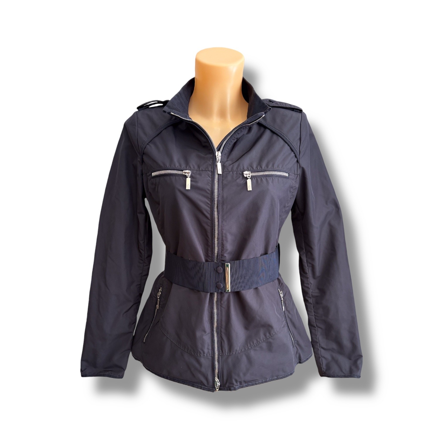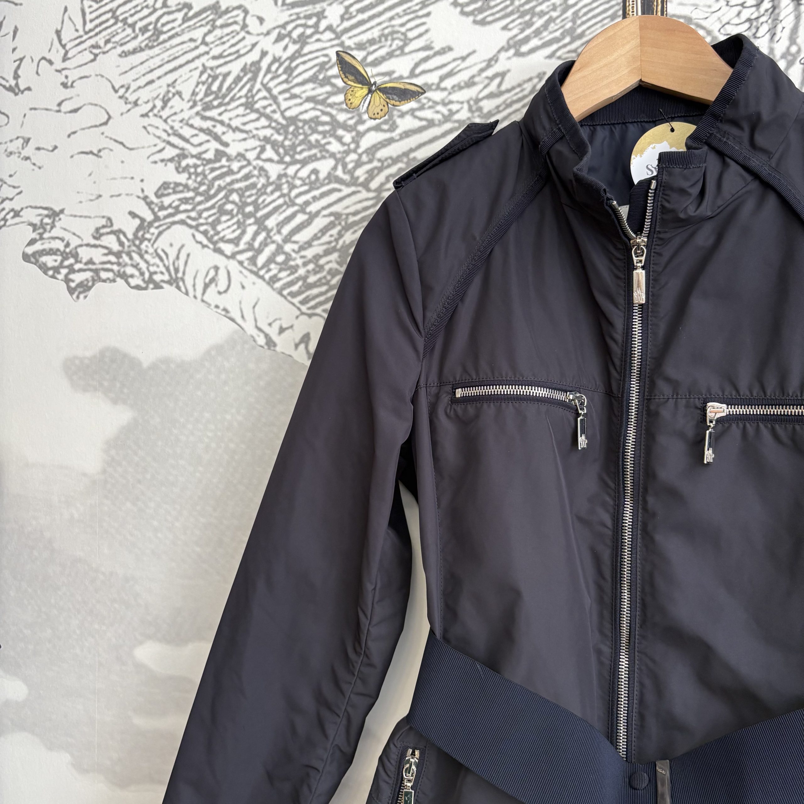 Coloris bleu foncé, coupe féminine soulignant la silhouette grâce à une ceinture à clip ajustable et un bas légèrement évasé. Un modèle à la fois chic et confortable, idéal pour conjuguer style et fonctionnalité